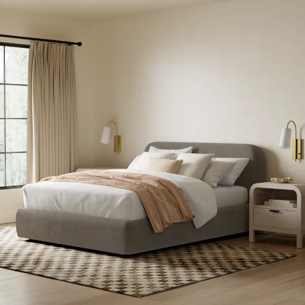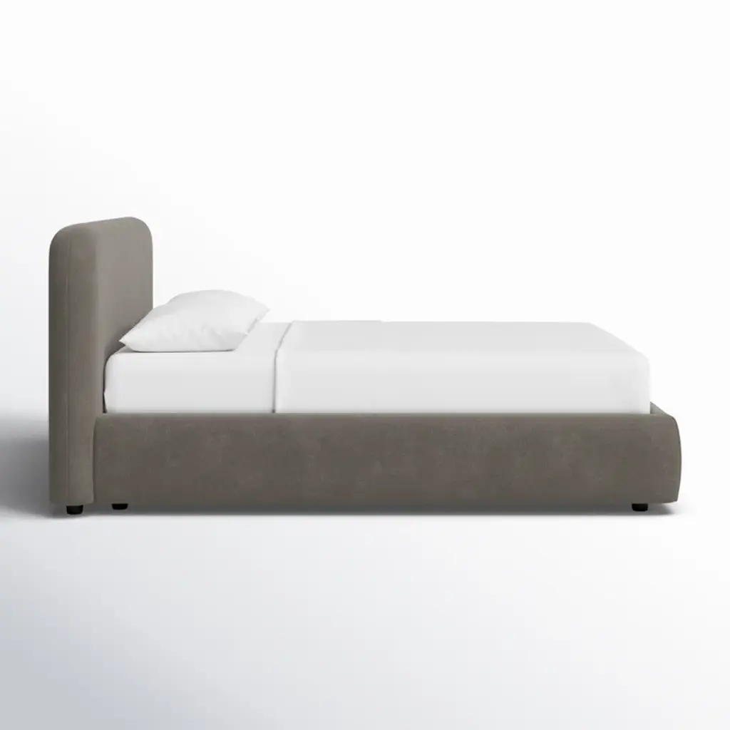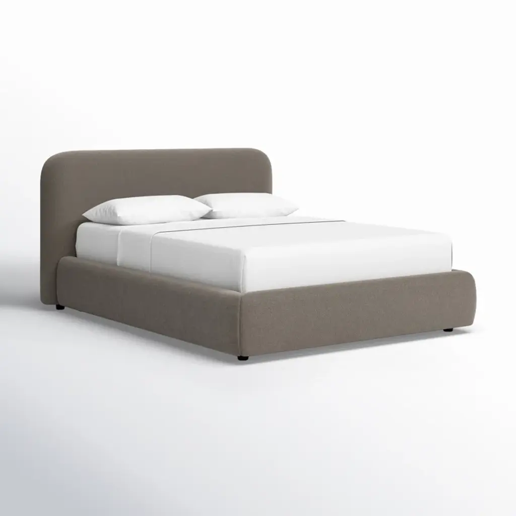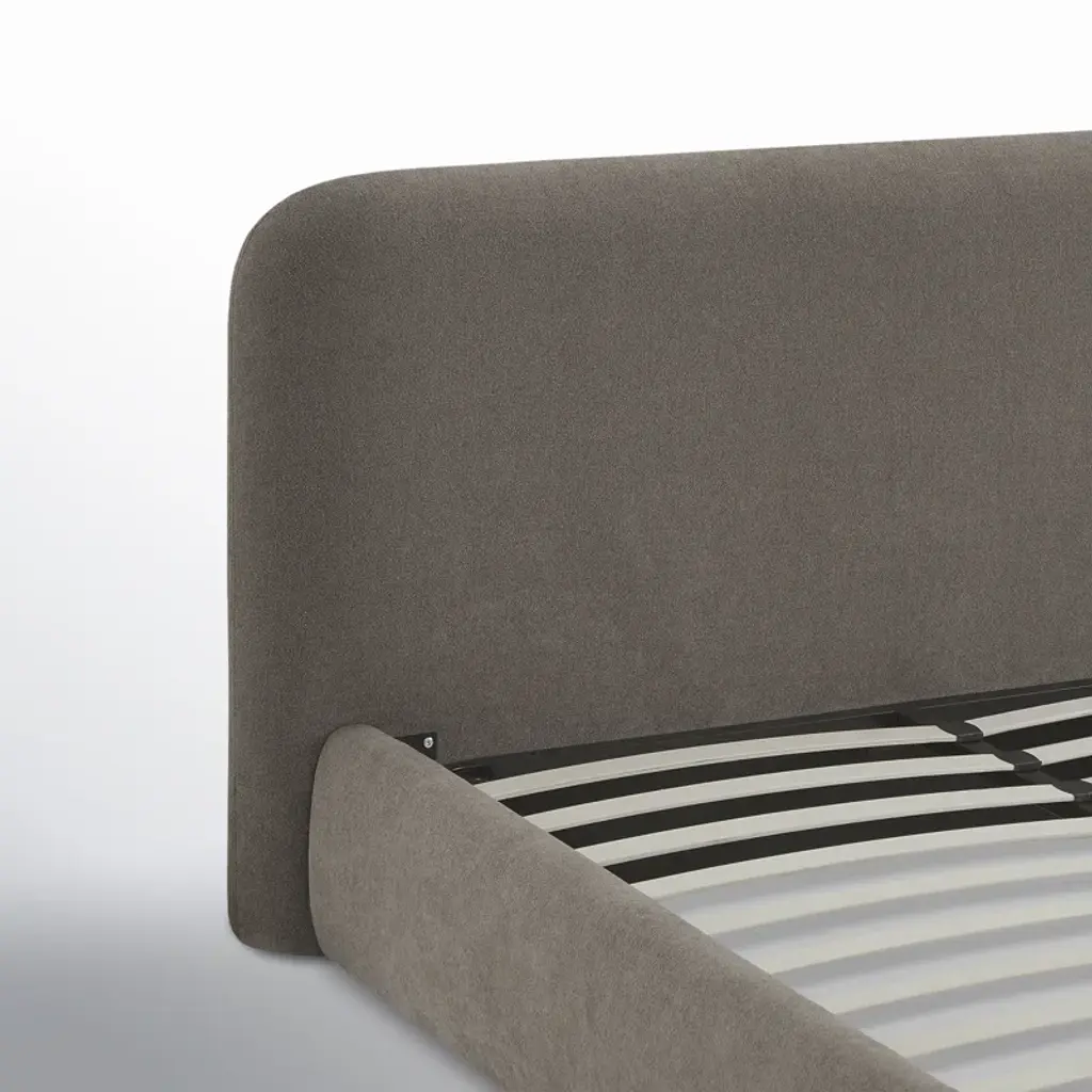 Dream big with our platform bed. A wooden frame is fully upholstered in your choice of fabric, while the foam-filled headboard invites you to lean back with a good book before lights out. Its rounded edges also give off a soft yet contemporary vibe. A slat kit is included, so there's no need for a box spring. Top with your preferred mattress and favorite linens, and you'll be all set for sleep.