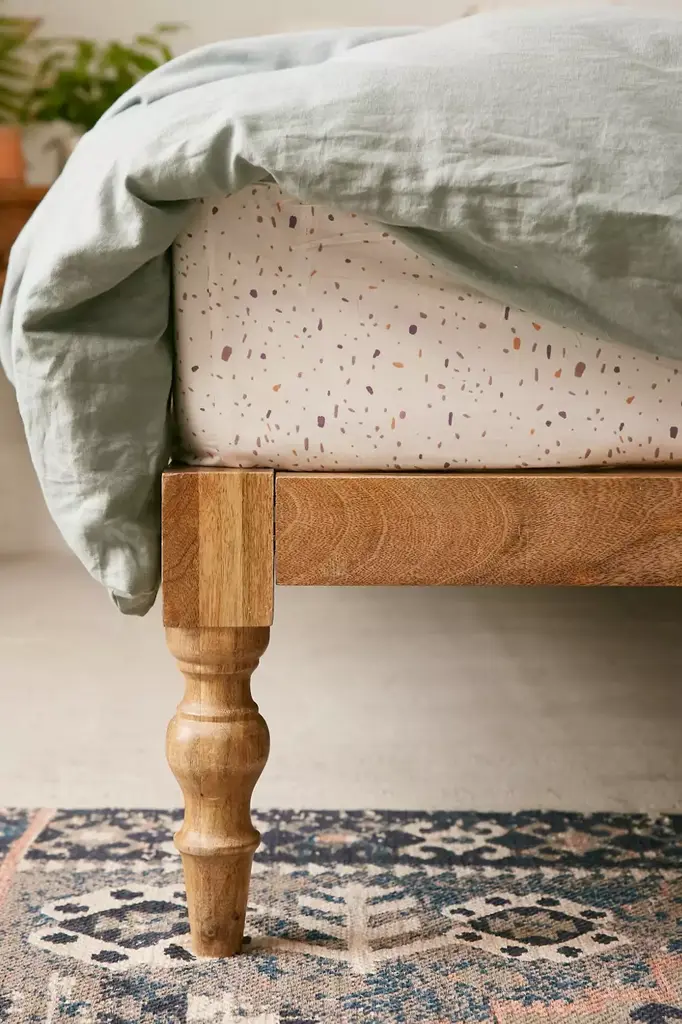 Create the perfect bohemian oasis with this platform bed from UO Home. Carved from sustainable mango wood, this mid-height boho bed has a sturdy slatted platform set on turned legs. Complete with natural and white finishes that blend with any aesthetic. Made from natural materials, each bed is one-of-a-kind with a unique finish that has natural variance from piece to piece. Pair with your mattress (no box spring needed) and favorite UO Home bedding for a cozy boho space. Available exclusively at Urban Outfitters.