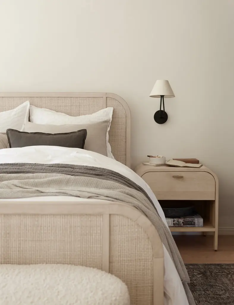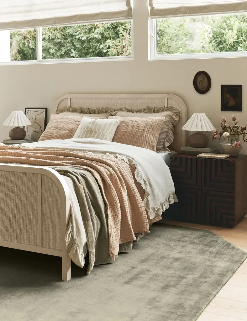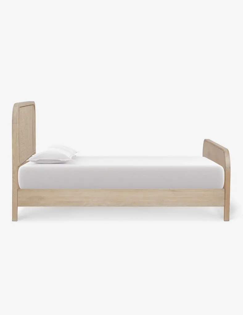 This solid oak bed frame is grounded by curved lines set off by cane paneling at the foot and headboard. A whitewashed finish warmly compliments the arched corners and woven details of this platform bed's understated design. Echo the natural texture of this cane bedroom furniture with some fresh linen bedding or other handwoven fabrics.