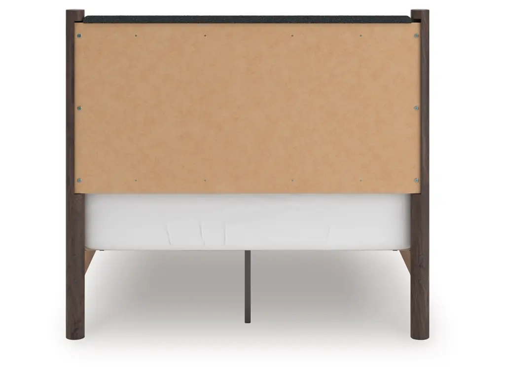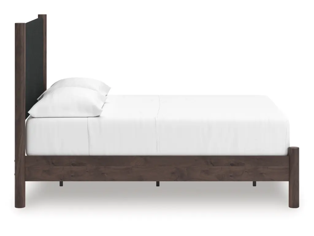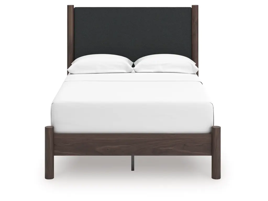 Crafted with both form and function in mind, the Cadmori full upholstered panel platform bed brings a dash of retro-cool character to your modern boho aesthetic. Its textured black headboard fabric adds a trend-right touch to the classic silhouette. Warmly welcoming with a rich brown finish, this bed pairs well with muted hues, earth tones and other neutrals alike. What a refined take on easygoing style.