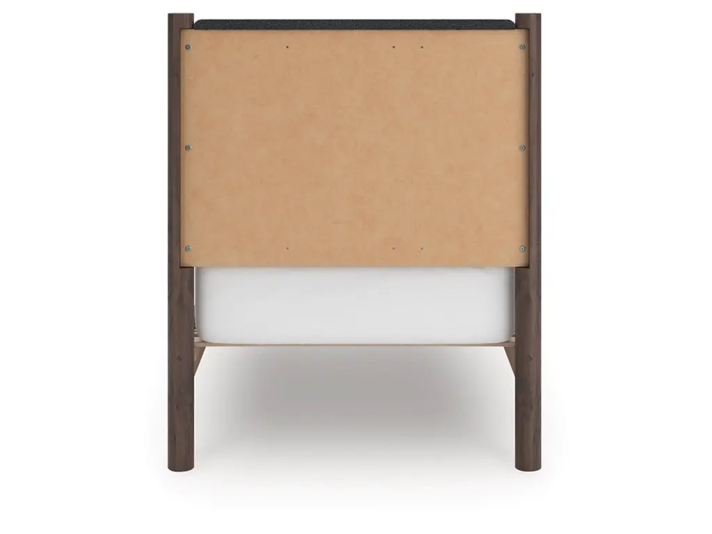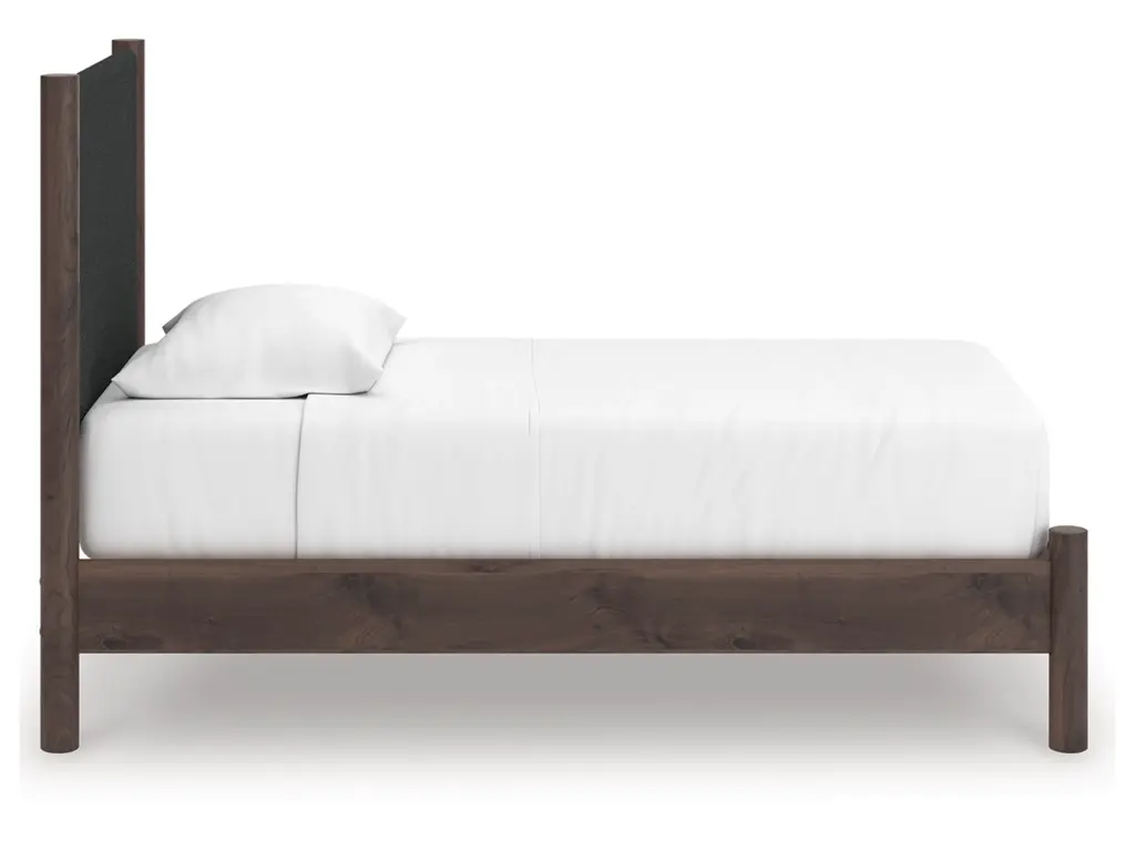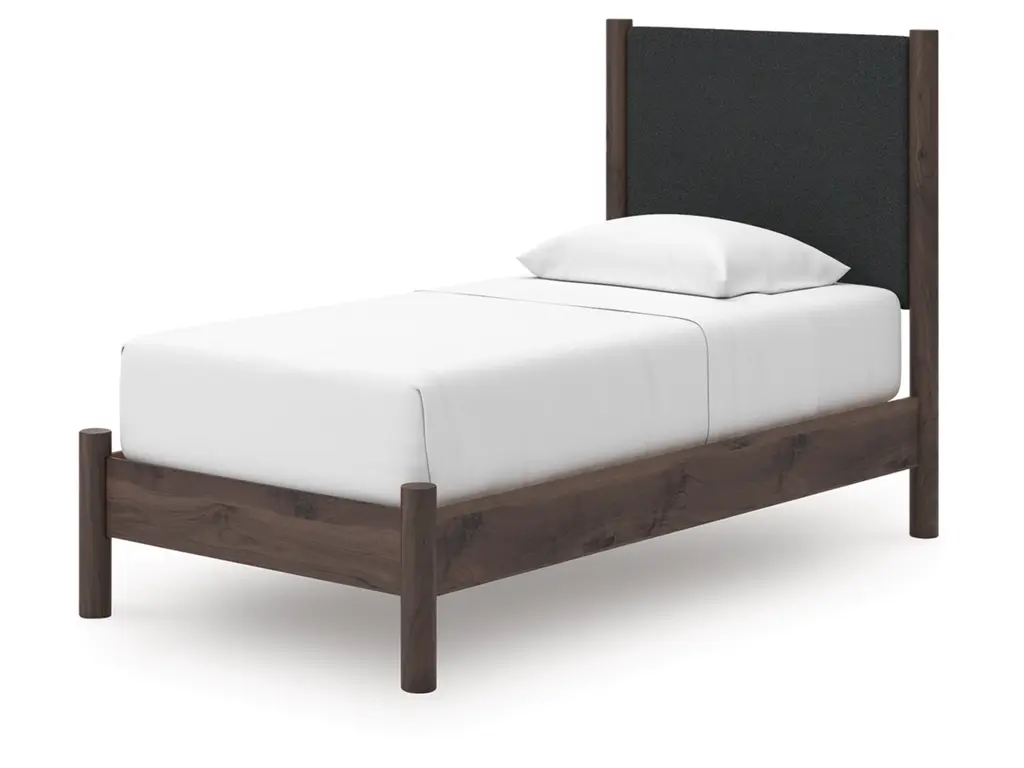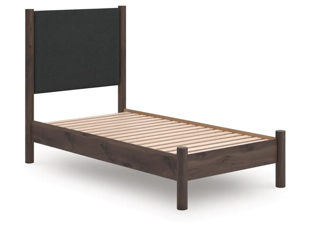 Crafted with both form and function in mind, the Cadmori twin upholstered panel platform bed brings a dash of retro-cool character to your modern boho aesthetic. Its textured black headboard fabric adds a trend-right touch to the classic silhouette. Warmly welcoming with a rich brown finish, this bed pairs well with muted hues, earth tones and other neutrals alike. What a refined take on easygoing style.