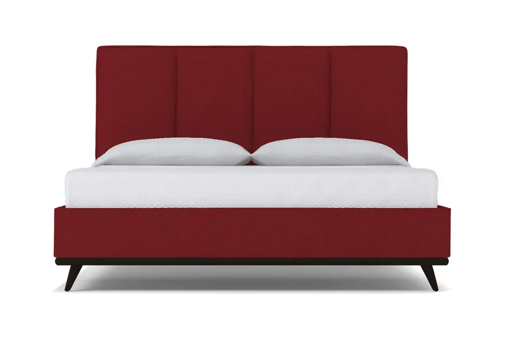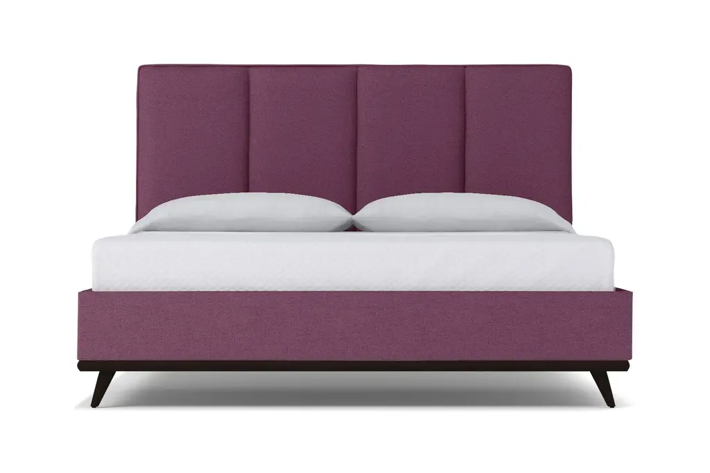 The Carter Upholstered Platform Bed from Apt2B is an elegantly-crafted homage to Mid-Century Modern design with the benefits of modern and contemporary style. The Carter Upholstered Bed, designed by Apt2B resident designer Kyle Schuneman, features an eye-catching channel tufted headboard and a set of stylish, angled, hardwood legs. An exposed hardwood base along the footboard and the headboard highlights the craftsmanship and detailing on this exquisite fabric upholstered bed. Your pets will also appreciate the 7.5"h legs, which provide plenty of room for exploration and afternoon naps. The Carter is a fully upholstered fabric bed, which means it looks incredible from every angle. And, trust us, you will want to admire this extra touch upholstery bed from every angle. The Carter Upholstered Platform Bed is one of Apt2B's fabric upholstered beds that we actually build to order in our downtown Los Angeles factory (made in the USA!). The Carter is available in a Queen size, a King size, California King, and even a Full size by request! This is a true platform bed that features hardwood slats, but it does require a bunkie board as additional mattress support. A box spring can also be used for a more traditional, taller look. The Carter is also available in your choice of fabrics. You can choose from any Apt2B's vast selection of kid friendly and pet friendly fabric offerings! Whether you're looking for a navy blue upholstered bed or a pink upholstered bed we've got you covered.