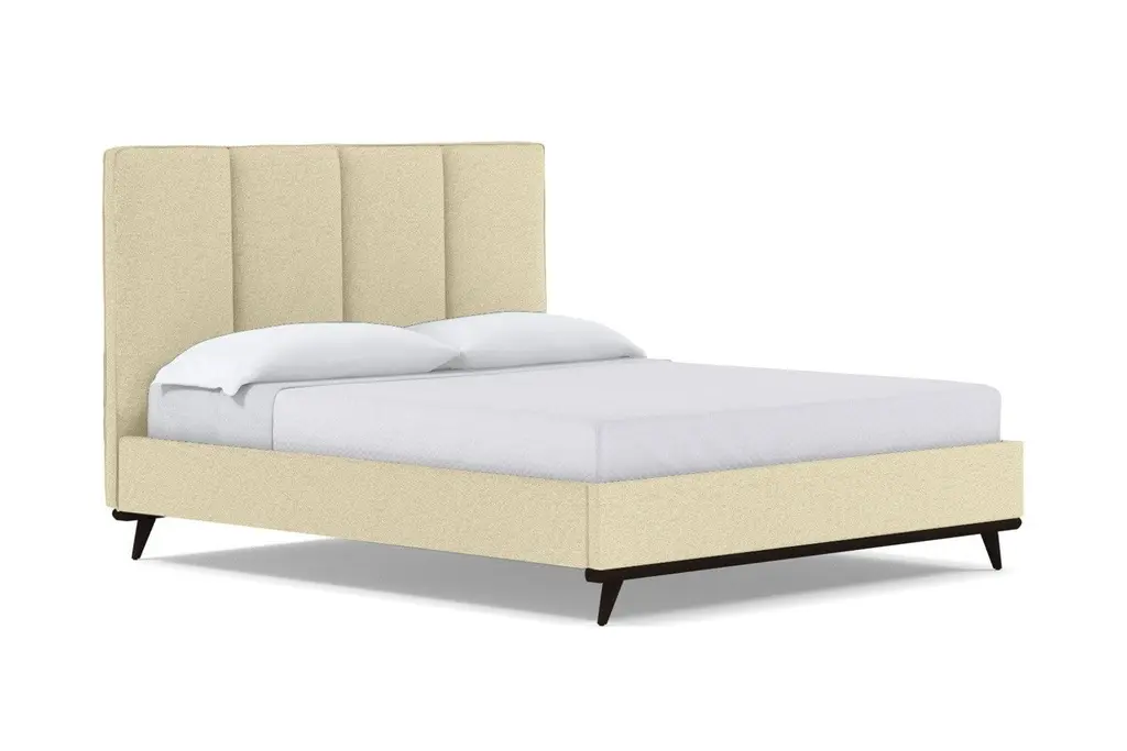 The Carter Upholstered Platform Bed from Apt2B is an elegantly-crafted homage to Mid-Century Modern design with the benefits of modern and contemporary style. The Carter Upholstered Bed, designed by Apt2B resident designer Kyle Schuneman, features an eye-catching channel tufted headboard and a set of stylish, angled, hardwood legs. An exposed hardwood base along the footboard and the headboard highlights the craftsmanship and detailing on this exquisite fabric upholstered bed. Your pets will also appreciate the 7.5"h legs, which provide plenty of room for exploration and afternoon naps. The Carter is a fully upholstered fabric bed, which means it looks incredible from every angle. And, trust us, you will want to admire this extra touch upholstery bed from every angle. The Carter Upholstered Platform Bed is one of Apt2B's fabric upholstered beds that we actually build to order in our downtown Los Angeles factory (made in the USA!). The Carter is available in a Queen size, a King size, California King, and even a Full size by request! This is a true platform bed that features hardwood slats, but it does require a bunkie board as additional mattress support. A box spring can also be used for a more traditional, taller look. The Carter is also available in your choice of fabrics. You can choose from any Apt2B's vast selection of kid friendly and pet friendly fabric offerings! Whether you're looking for a navy blue upholstered bed or a pink upholstered bed we've got you covered.