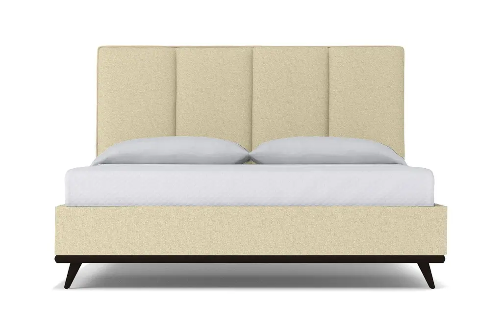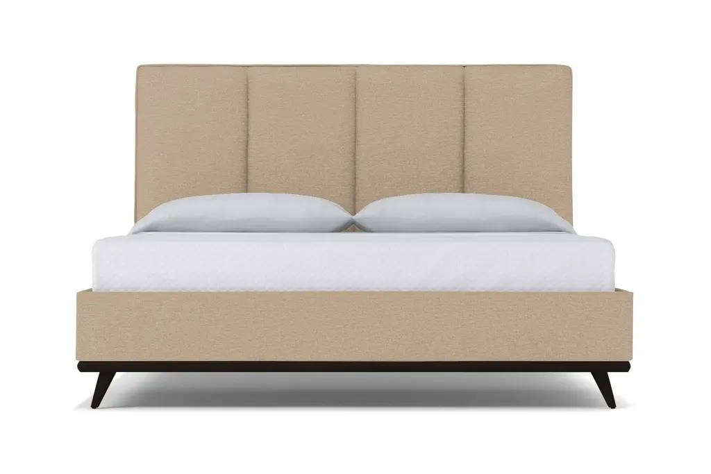 The Carter Upholstered Platform Bed from Apt2B is an elegantly-crafted homage to Mid-Century Modern design with the benefits of modern and contemporary style. The Carter Upholstered Bed, designed by Apt2B resident designer Kyle Schuneman, features an eye-catching channel tufted headboard and a set of stylish, angled, hardwood legs. An exposed hardwood base along the footboard and the headboard highlights the craftsmanship and detailing on this exquisite fabric upholstered bed. Your pets will also appreciate the 7.5"h legs, which provide plenty of room for exploration and afternoon naps. The Carter is a fully upholstered fabric bed, which means it looks incredible from every angle. And, trust us, you will want to admire this extra touch upholstery bed from every angle. The Carter Upholstered Platform Bed is one of Apt2B's fabric upholstered beds that we actually build to order in our downtown Los Angeles factory (made in the USA!). The Carter is available in a Queen size, a King size, California King, and even a Full size by request! This is a true platform bed that features hardwood slats, but it does require a bunkie board as additional mattress support. A box spring can also be used for a more traditional, taller look. The Carter is also available in your choice of fabrics. You can choose from any Apt2B's vast selection of kid friendly and pet friendly fabric offerings! Whether you're looking for a navy blue upholstered bed or a pink upholstered bed we've got you covered.