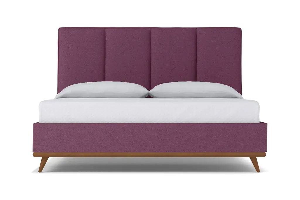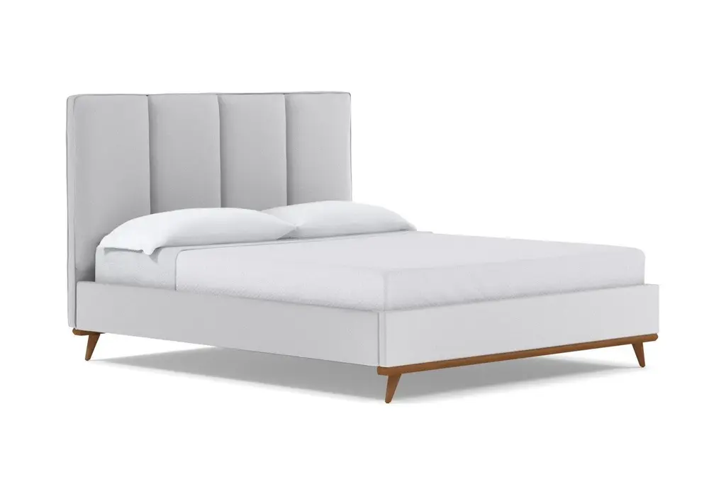 The Carter Upholstered Platform Bed from Apt2B is an elegantly-crafted homage to Mid-Century Modern design with the benefits of modern and contemporary style. The Carter Upholstered Bed, designed by Apt2B resident designer Kyle Schuneman, features an eye-catching channel tufted headboard and a set of stylish, angled, hardwood legs. An exposed hardwood base along the footboard and the headboard highlights the craftsmanship and detailing on this exquisite fabric upholstered bed. Your pets will also appreciate the 7.5"h legs, which provide plenty of room for exploration and afternoon naps. The Carter is a fully upholstered fabric bed, which means it looks incredible from every angle. And, trust us, you will want to admire this extra touch upholstery bed from every angle. The Carter Upholstered Platform Bed is one of Apt2B's fabric upholstered beds that we actually build to order in our downtown Los Angeles factory (made in the USA!). The Carter is available in a Queen size, a King size, California King, and even a Full size by request! This is a true platform bed that features hardwood slats, but it does require a bunkie board as additional mattress support. A box spring can also be used for a more traditional, taller look. The Carter is also available in your choice of fabrics. You can choose from any Apt2B's vast selection of kid friendly and pet friendly fabric offerings! Whether you're looking for a navy blue upholstered bed or a pink upholstered bed we've got you covered.