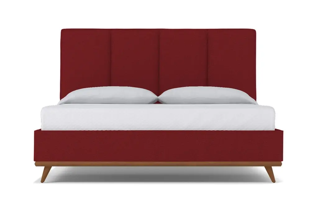 The Carter Upholstered Platform Bed from Apt2B is an elegantly-crafted homage to Mid-Century Modern design with the benefits of modern and contemporary style. The Carter Upholstered Bed, designed by Apt2B resident designer Kyle Schuneman, features an eye-catching channel tufted headboard and a set of stylish, angled, hardwood legs. An exposed hardwood base along the footboard and the headboard highlights the craftsmanship and detailing on this exquisite fabric upholstered bed. Your pets will also appreciate the 7.5"h legs, which provide plenty of room for exploration and afternoon naps. The Carter is a fully upholstered fabric bed, which means it looks incredible from every angle. And, trust us, you will want to admire this extra touch upholstery bed from every angle. The Carter Upholstered Platform Bed is one of Apt2B's fabric upholstered beds that we actually build to order in our downtown Los Angeles factory (made in the USA!). The Carter is available in a Queen size, a King size, California King, and even a Full size by request! This is a true platform bed that features hardwood slats, but it does require a bunkie board as additional mattress support. A box spring can also be used for a more traditional, taller look. The Carter is also available in your choice of fabrics. You can choose from any Apt2B's vast selection of kid friendly and pet friendly fabric offerings! Whether you're looking for a navy blue upholstered bed or a pink upholstered bed we've got you covered.