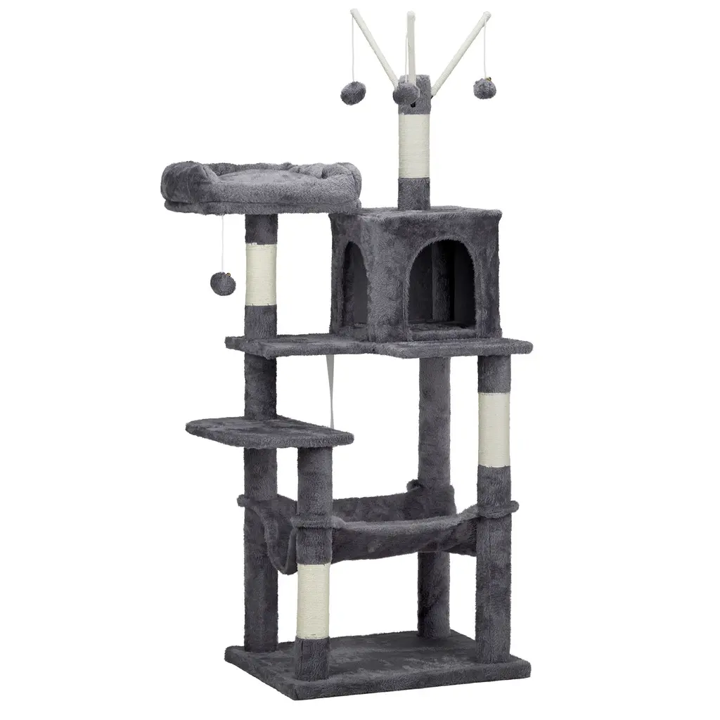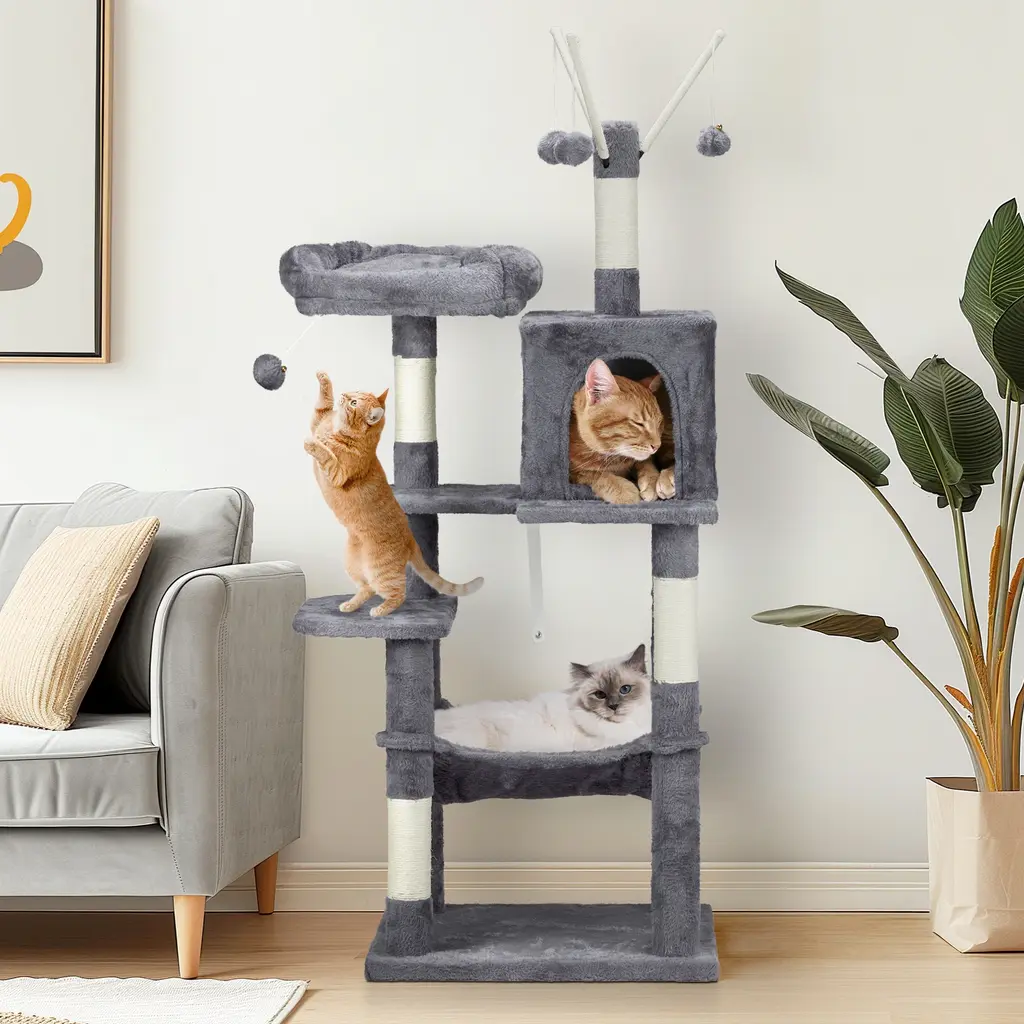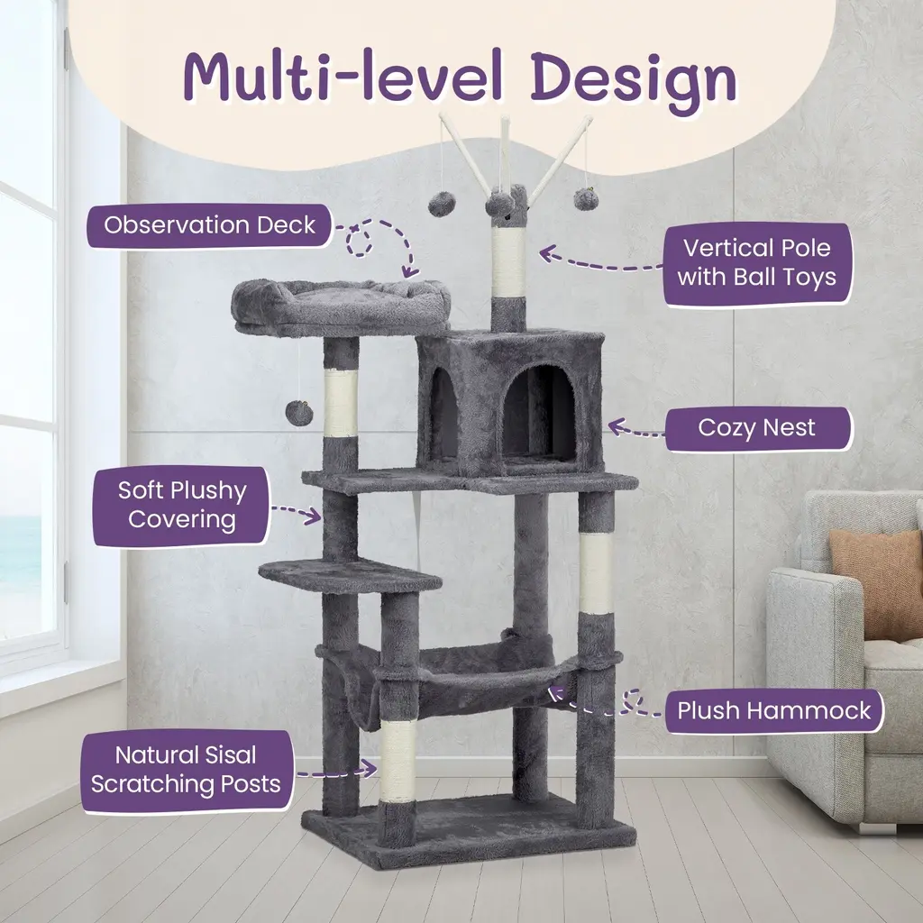 Specification: Key Features: Description: This 57-inch cat tree in dark grey is the perfect playground for indoor cats, featuring a multi-level design with scratching posts, padded platform beds, toy balls, and a large cozy condo. Made from durable engineered wood, plush fabric, and sisal rope, it provides a secure, stable structure for your cats to climb, scratch, and sleep. The sisal-wrapped posts are ideal for maintaining healthy claws, while the soft bedding offers ultimate comfort for lounging and napping. With its sturdy build and interactive features, this cat tower offers endless entertainment and relaxation for your feline companions.