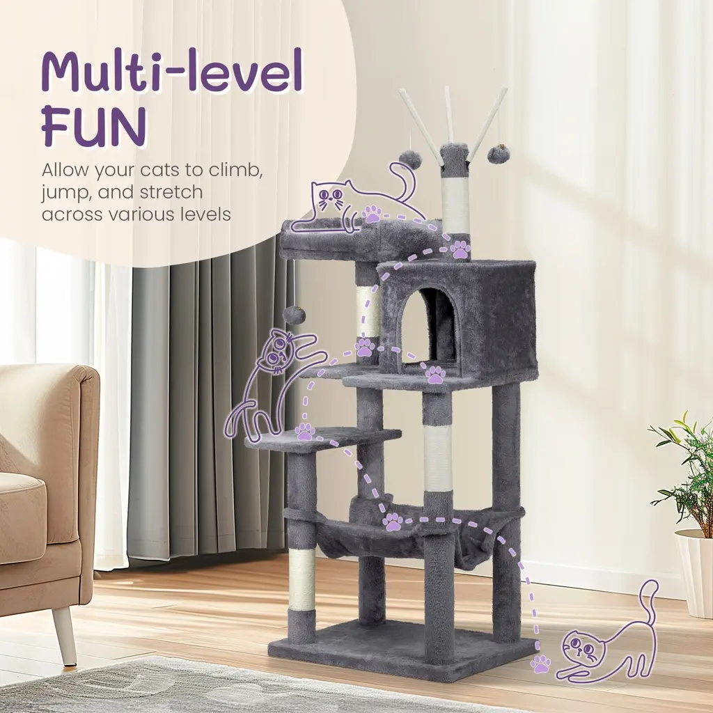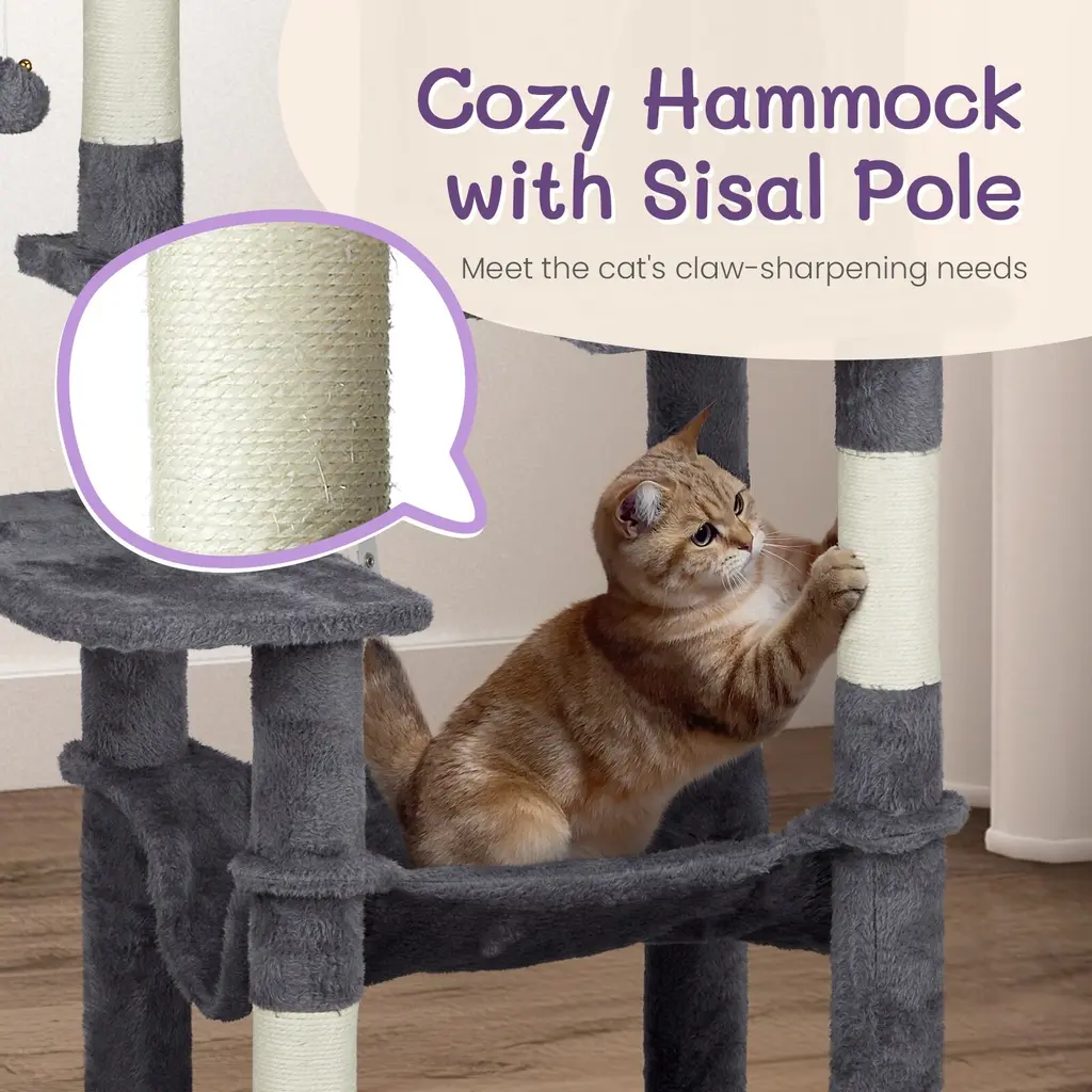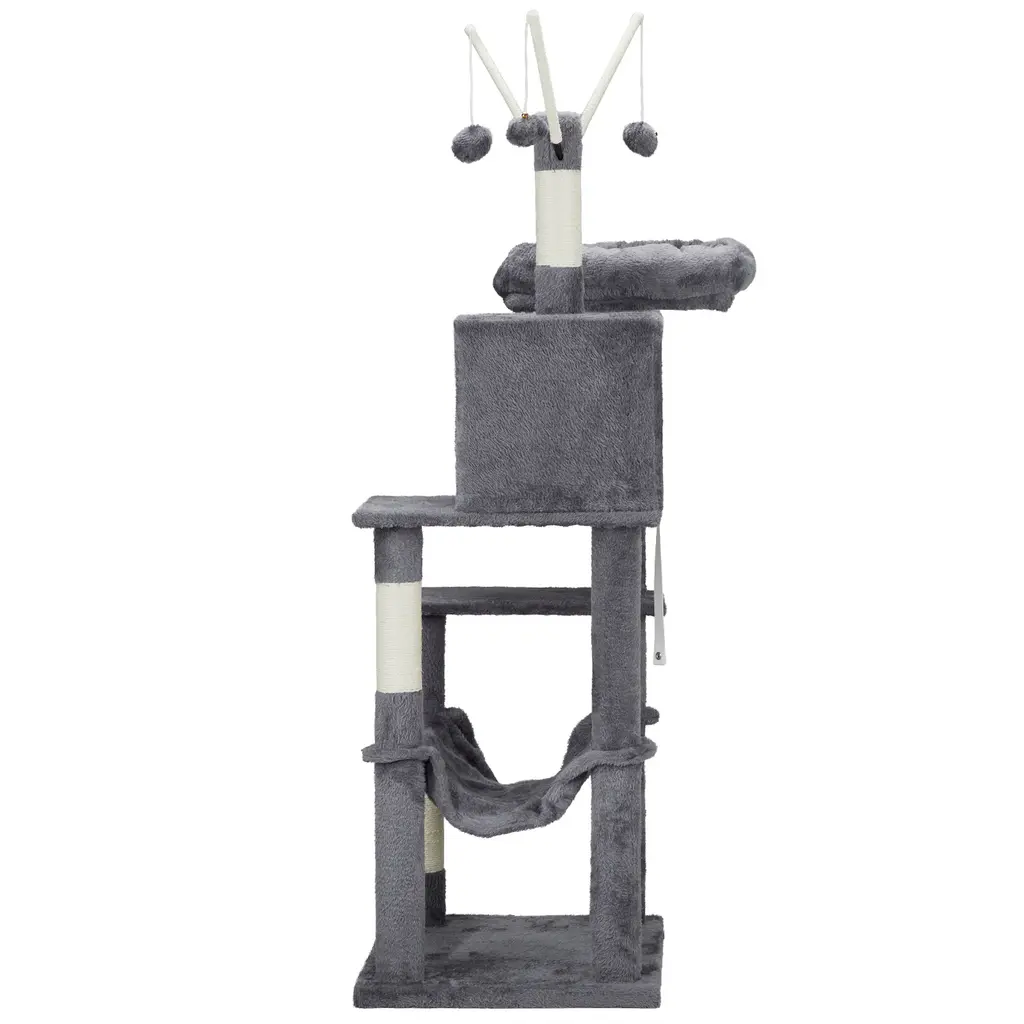 Specification: Key Features: Description: This 57-inch cat tree in dark grey is the perfect playground for indoor cats, featuring a multi-level design with scratching posts, padded platform beds, toy balls, and a large cozy condo. Made from durable engineered wood, plush fabric, and sisal rope, it provides a secure, stable structure for your cats to climb, scratch, and sleep. The sisal-wrapped posts are ideal for maintaining healthy claws, while the soft bedding offers ultimate comfort for lounging and napping. With its sturdy build and interactive features, this cat tower offers endless entertainment and relaxation for your feline companions.