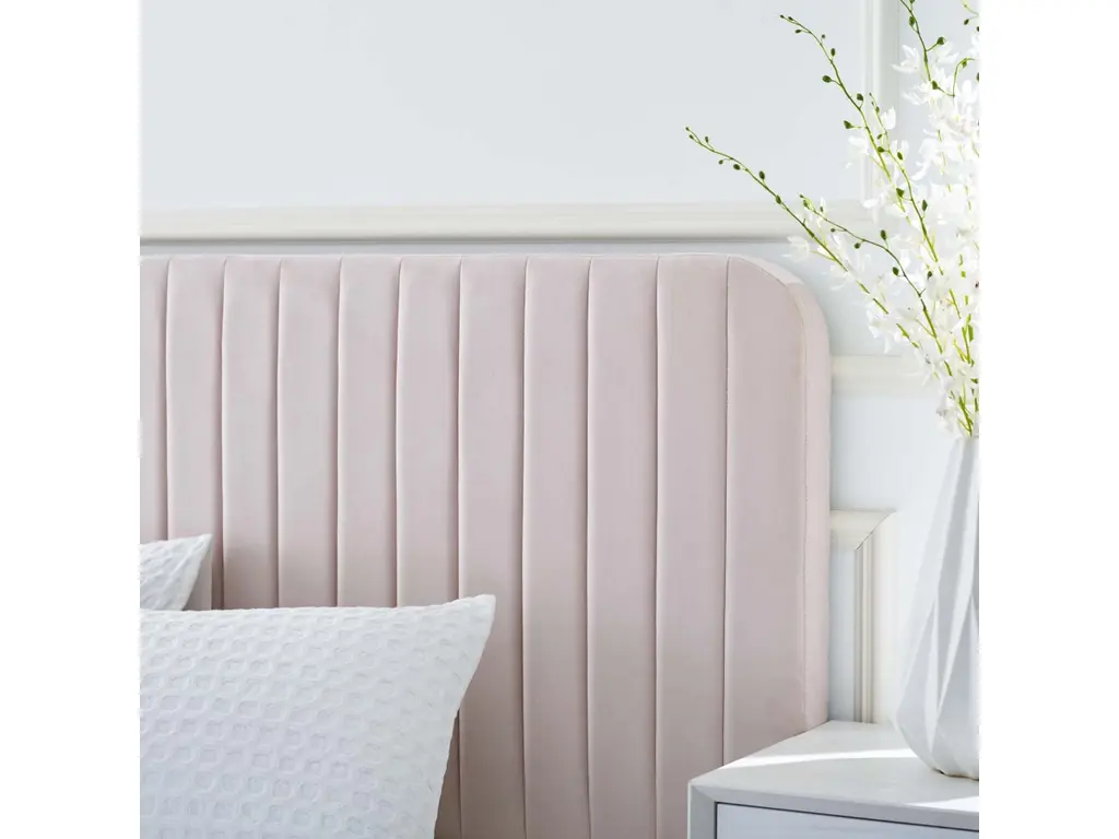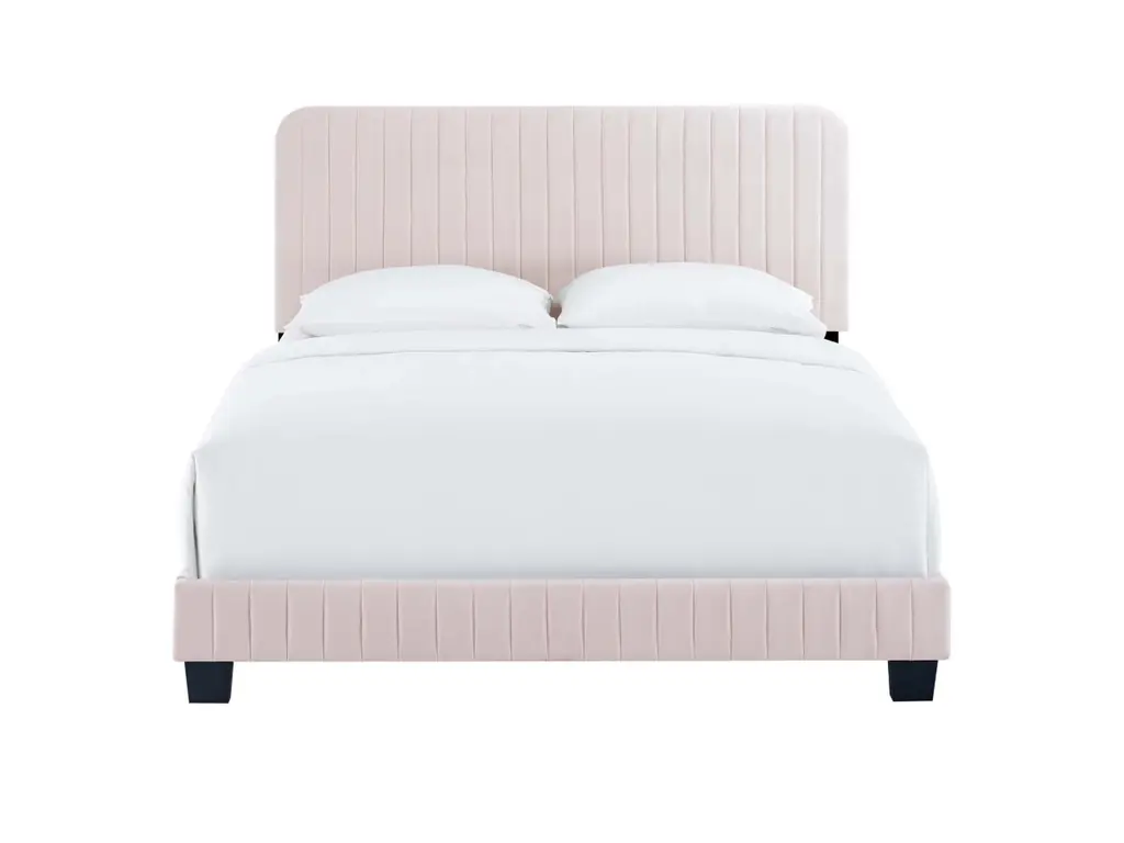 Elevate your master bedroom or guest bedroom style with the luxe texture and glam deco elegance of the Celine King Platform Bed. Adorned with channel tufted detail, the king size headboard of this upholstered bed is padded in dense foam to offer supportive comfort while sitting up resting, relaxing, reading, or watching TV. Upholstered in stain-resistant performance velvet, this platform bed eliminates the need for a box spring with a wood slat support system to allow for ample air circulation and a reinforced center beam and support legs for added durability. A sturdy mattress foundation, this king size platform bed accommodates a variety of mattress styles including innerspring, memory foam, and latex. Assembly required. Weight Limit: 800 lbs.