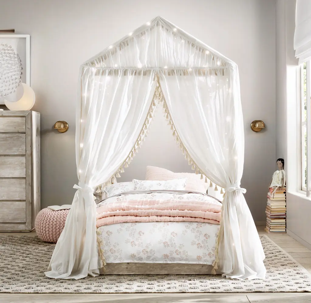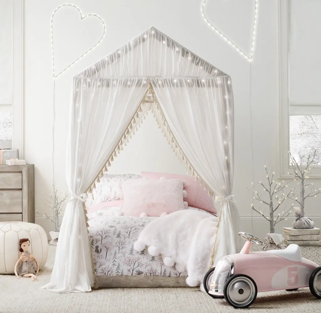 The simple, A-shaped frame of the iconic American barn inspired our bed. Draped in a diaphanous, tasseled canopy tied to trusses on either end, it's at once airy and enclosed – the perfect backdrop for fairy-tale dreams.