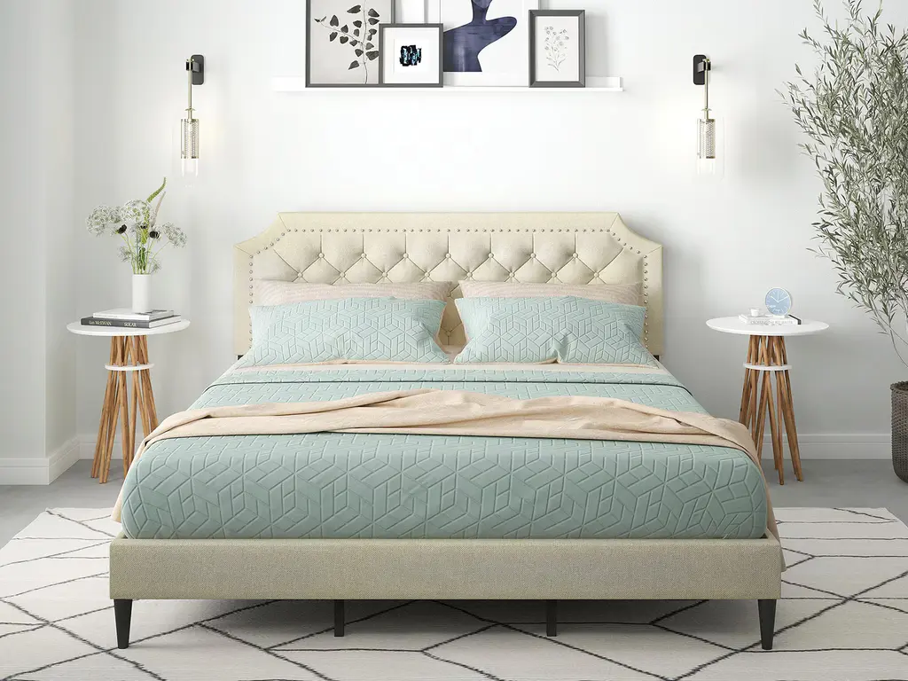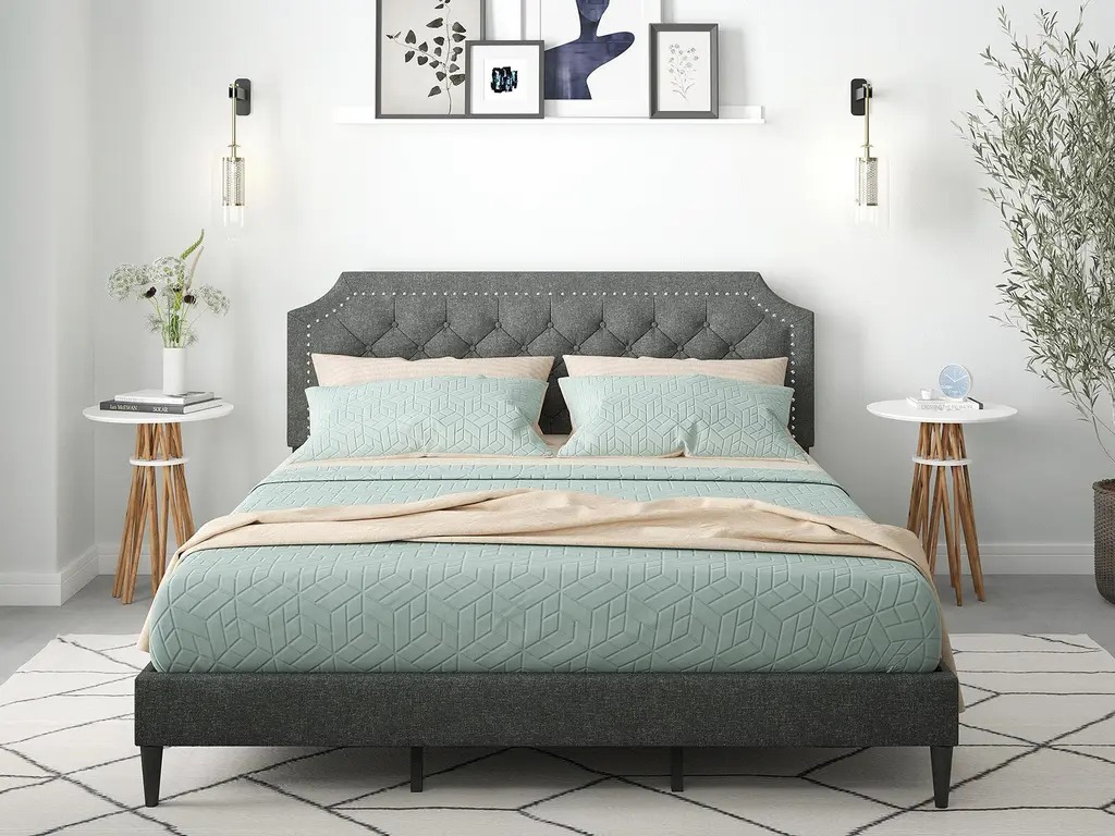 Bring a sophisticated blend of traditional and modern style to your bedroom with the Curta Upholstered Platform Bed Frame! Meticulously constructed with a solid frame made from composite wood, this bed adds comfort with high-quality upholstery foam wrapped in easy-to-clean polyester blend fabric. The gently clipped corners of the sculpted headboard are accented by a striking row of nail head trim. A stitched, diamond pattern of soft tufting uses buttons as focal points to create an eye-catching look that's still soft enough to sleep with. Solid legs in neutral black anchor the design.