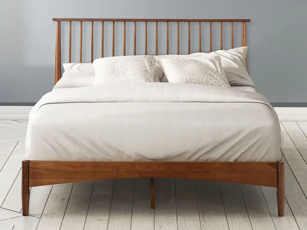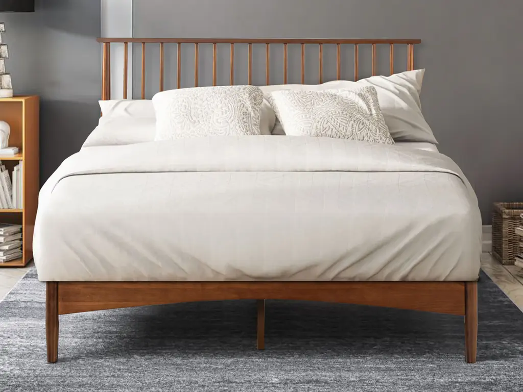With a classic design, the Sleepy's Deluxe Mid Century Wood Spindle Platform Bed will make a simple statement as the focal point of your bedroom. This mattress foundation is a true mid-century wooden bed frame, with rounded legs and a sturdy headboard with an acorn finish that will easily complement any décor. This platform bed is built with a solid pine frame to support you and your mattress comfortably- no box spring necessary. The 12-inch platform has closely spaced wooden slats for extra stability to uphold and extend the life of your mattress, whether it’s spring, latex or memory foam. This classic bed frame is skillfully packed into one box and shipped to your door with all the tools, parts and step-by-step instructions needed to put it together without breaking a sweat. A 5-year warranty is also included to take all the stress out of this purchase. The perfect platform bed does exist in this beautifully crafted mid-century classic frame.