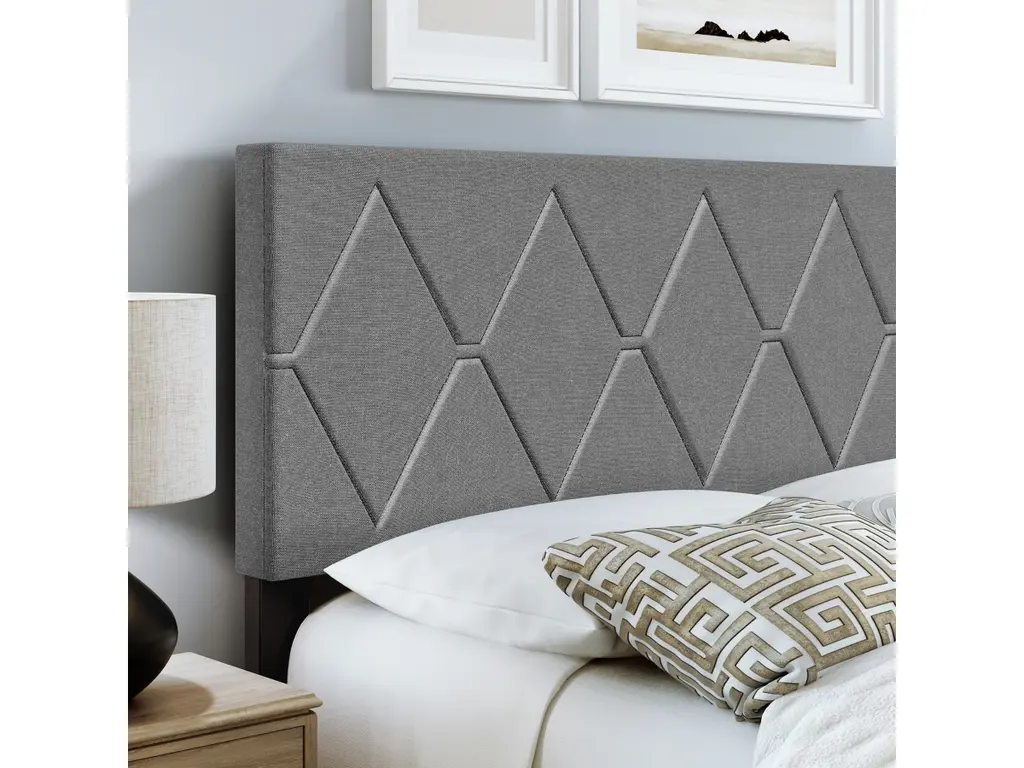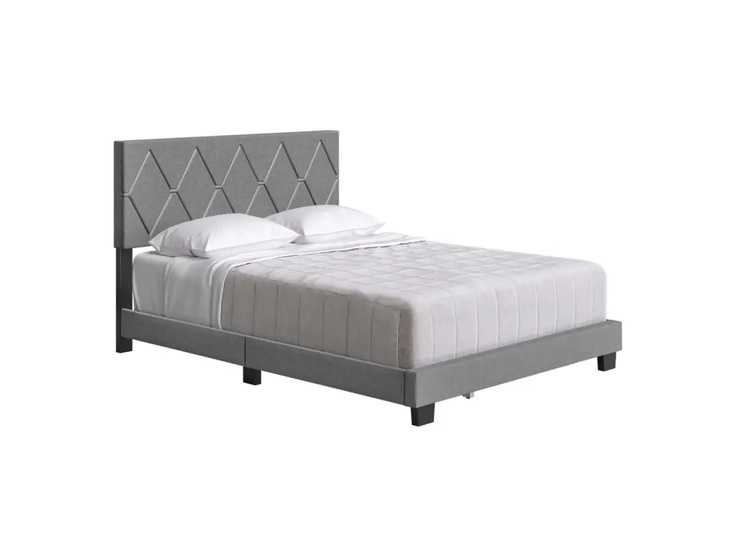 This unique, fully-upholstered bed with diamond-stitched detail on the headboard will be the statement piece in any bedroom. Headboard features elegantly-tufted diamond shapes with contrast stitching. Support system consists of 6 perimeter legs, 4 cross beams plus center support legs that easily support up to 700 lbs. You will need a box spring or foundation with this bed frame. This bed ships in 1 box for easy transport and is backed by a 1 Year Warranty.
