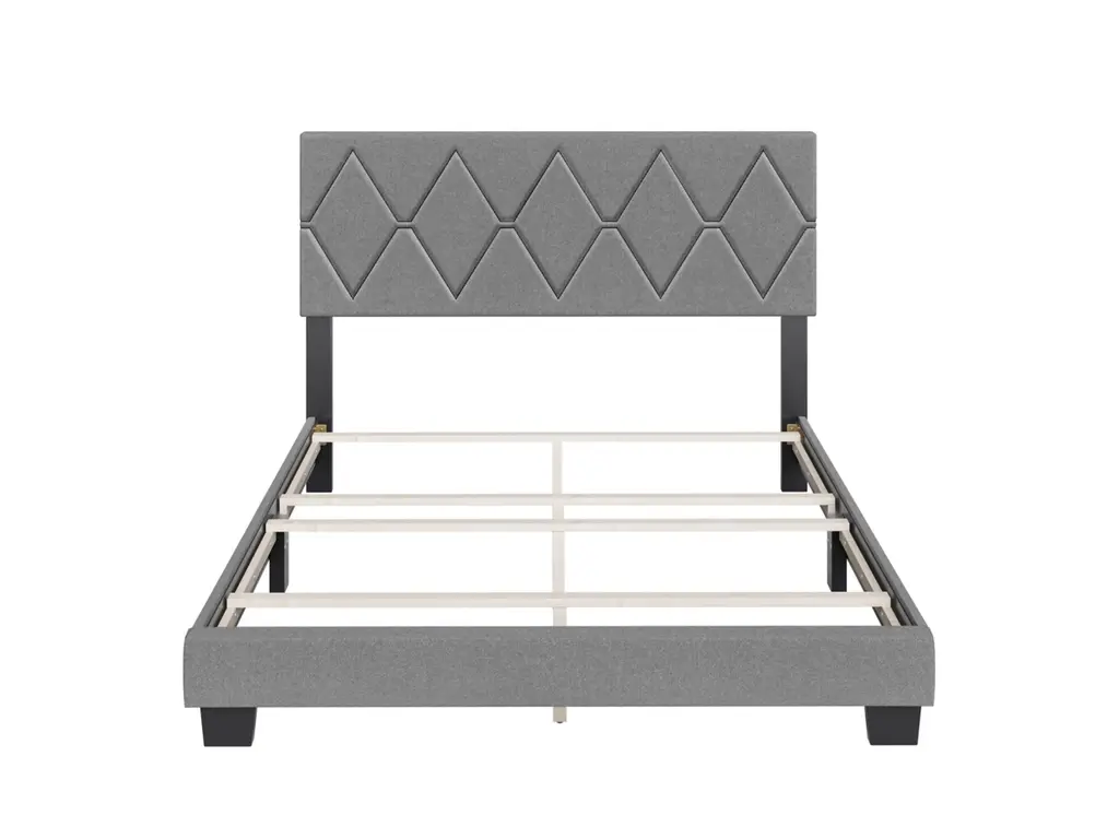 This unique, fully-upholstered bed with diamond-stitched detail on the headboard will be the statement piece in any bedroom. Headboard features elegantly-tufted diamond shapes with contrast stitching. Support system consists of 6 perimeter legs, 4 cross beams plus center support legs that easily support up to 700 lbs. You will need a box spring or foundation with this bed frame. This bed ships in 1 box for easy transport and is backed by a 1 Year Warranty.
