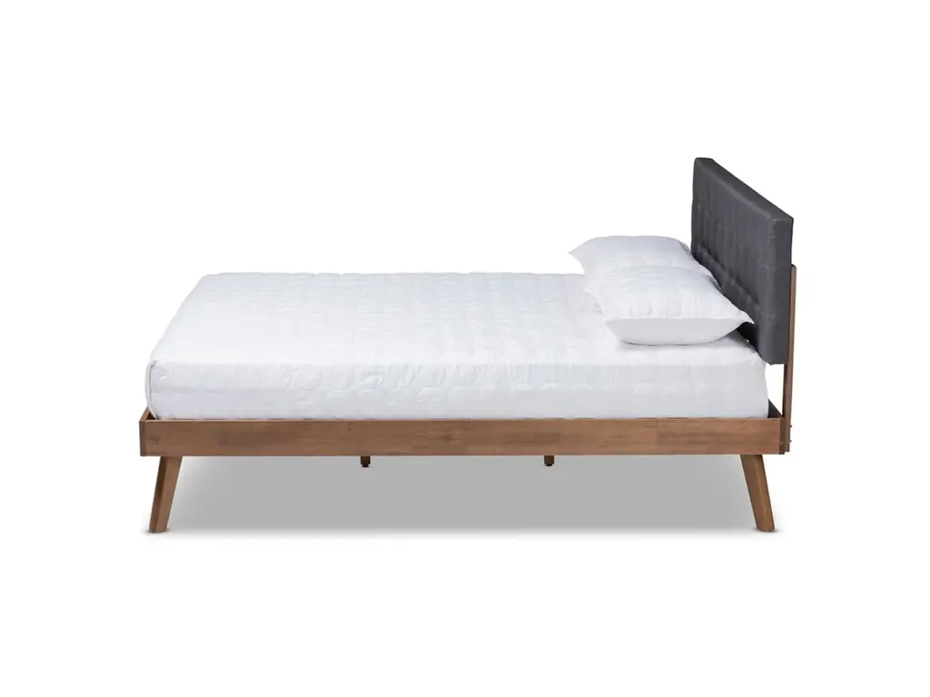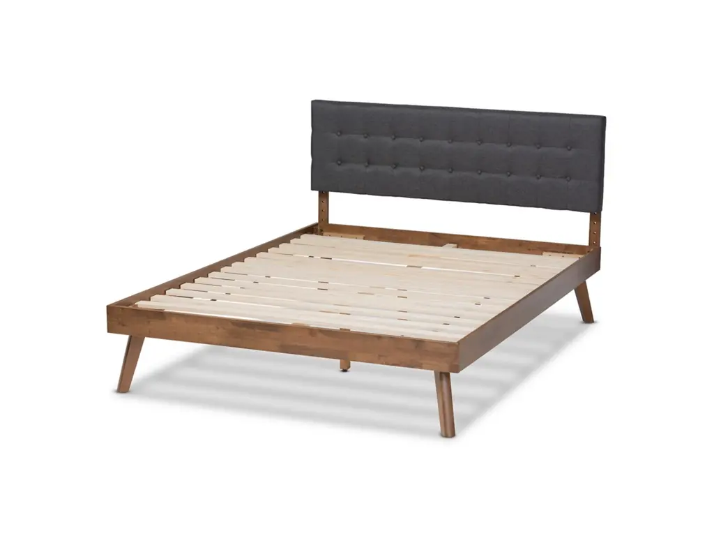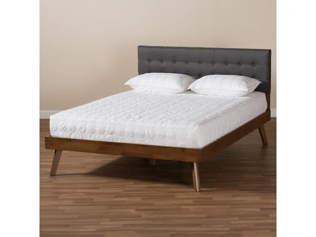 Natural wood tones are paired with grey hues to give this bed a cool, contemporary look that transforms any bedroom. Built with a sturdy wood frame, it features a low platform finished in a warm walnut-tone. Its splayed legs create a cool profile from any angle. The headboard is upholstered in a soft, foam-filled fabric that provides ample comfort for you to lean against. Button tufting adds dimension and elegance.