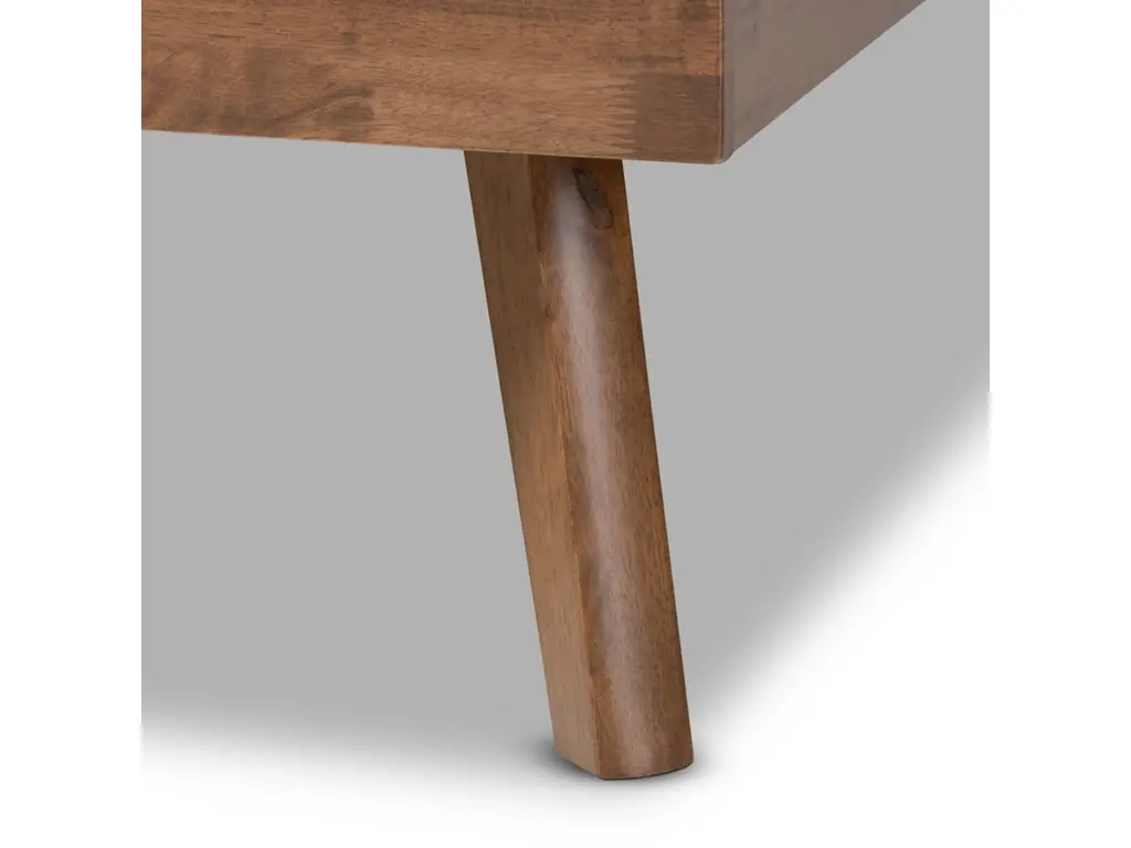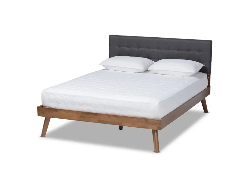 Natural wood tones are paired with grey hues to give this bed a cool, contemporary look that transforms any bedroom. Built with a sturdy wood frame, it features a low platform finished in a warm walnut-tone. Its splayed legs create a cool profile from any angle. The headboard is upholstered in a soft, foam-filled fabric that provides ample comfort for you to lean against. Button tufting adds dimension and elegance.