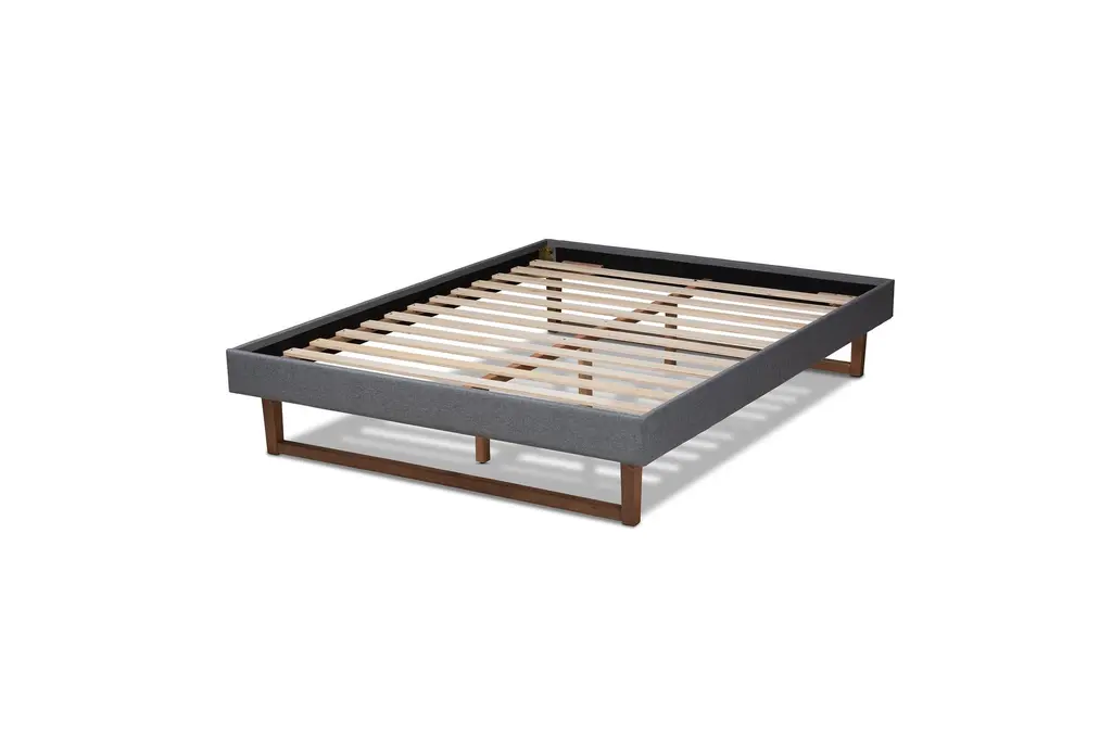 Introducing the Dextyr Full Dark Grey Fabric Upholstered Walnut Brown Finish Wood Platform Bed, a perfect blend of Mid-Century Modern style and practical functionality. This bed features dark grey fabric upholstery complemented by a walnut brown finish, creating a sophisticated look for any bedroom. The full-size platform bed eliminates the need for a box spring, providing both comfort and convenience.