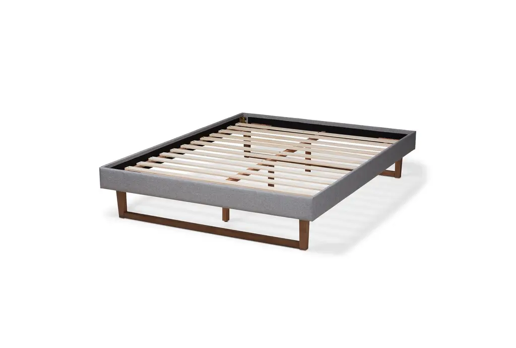 The Dextyr Full Light Grey Upholstered Walnut Brown Finish Wood Platform Bed is a stylish and comfortable addition to any bedroom. Its mid-century modern design brings a touch of elegance and sophistication to your space. The combination of gray fabric and walnut brown finish creates a timeless look that complements various decor styles.