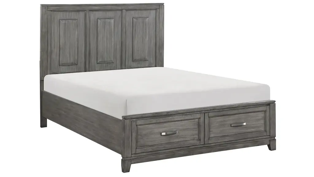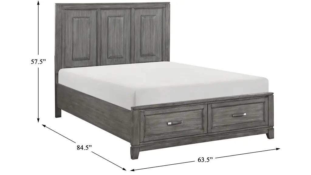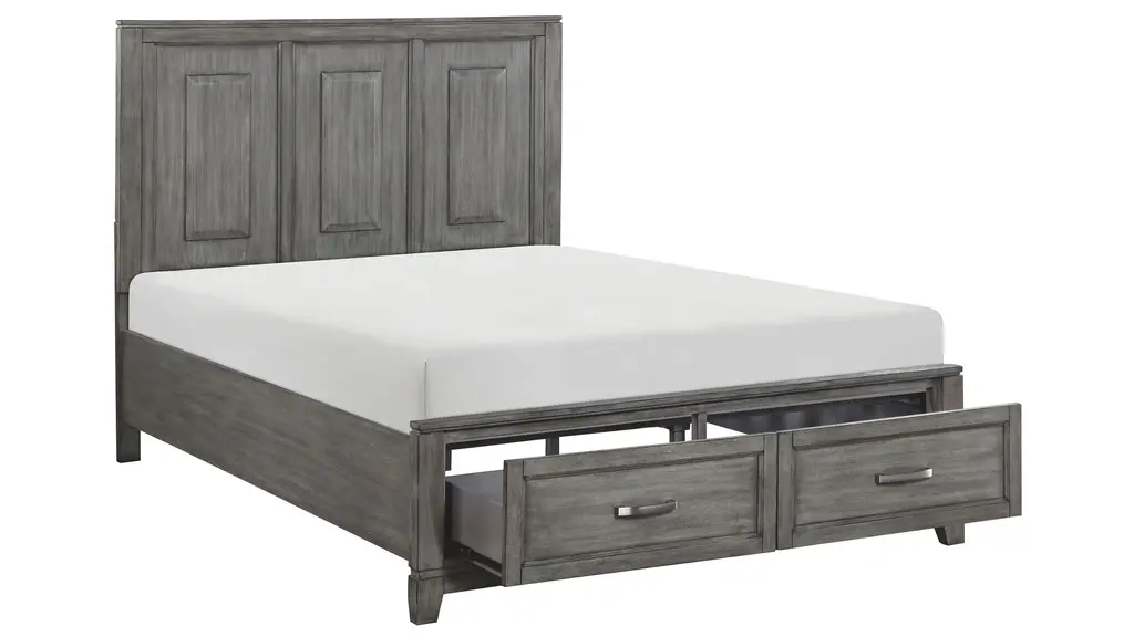 The Faustina Platform Bed blends transitional lines with rustic styling to create an elegant addition for your bedroom. The distinct grain of the okume veneer features a gray finish. The bed features metal bar hardware on the picture frame drawer fronts of the low-profile storage footboard, the two drawers creating additional space within your room for soft good storage.