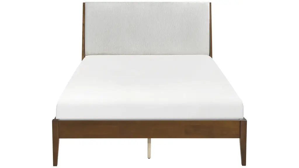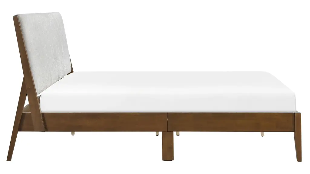 The Finley Platform Bed features a chestnut finish, its warm hue a perfect complement to the light gray chenille fabric upholstered headboard. Subtle Mid-Century Modern inspiration drives the design and lends a classic profile to the modern lines of the Finley Collection.