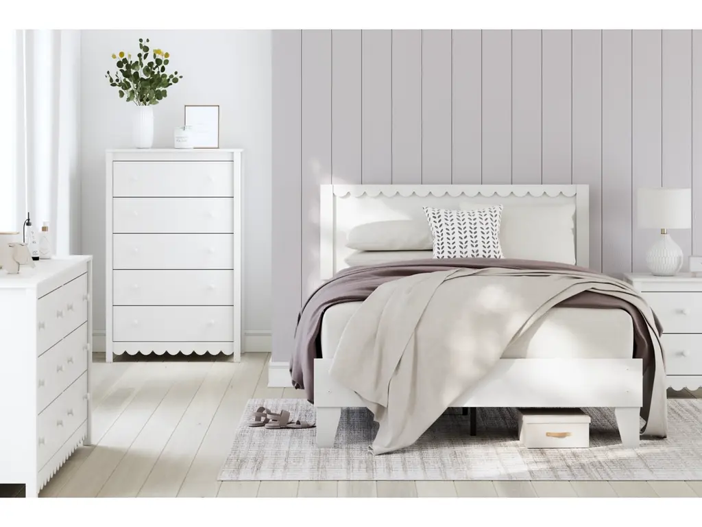 Thanks to its playful scalloped design, the Hallityn full platform bed is the perfect fit for cottage or coastal farmhouse interiors. Its matte white finish serves as the perfect backdrop to showcase your personal taste and creativity. Plus the low-profile bed frame fits right in with your minimalist sensibility.