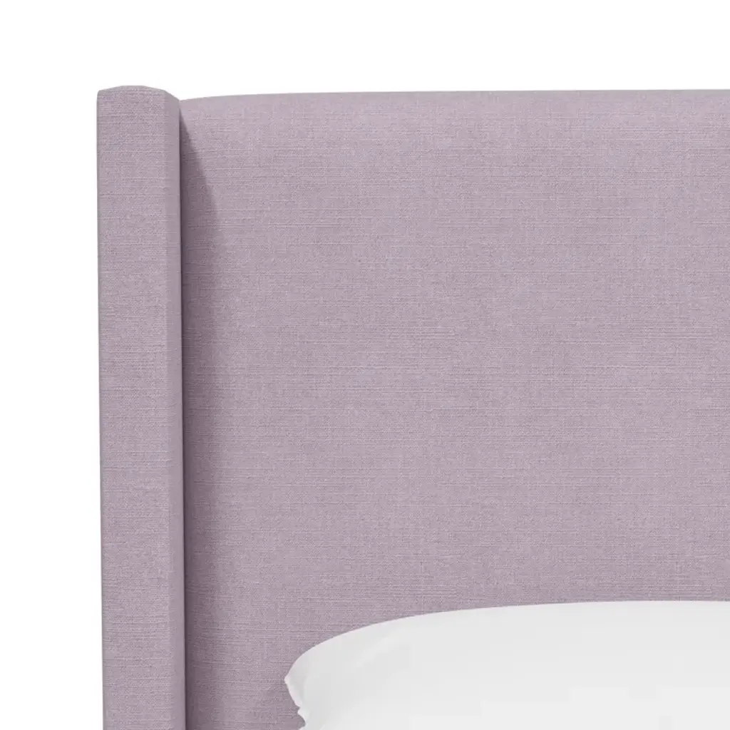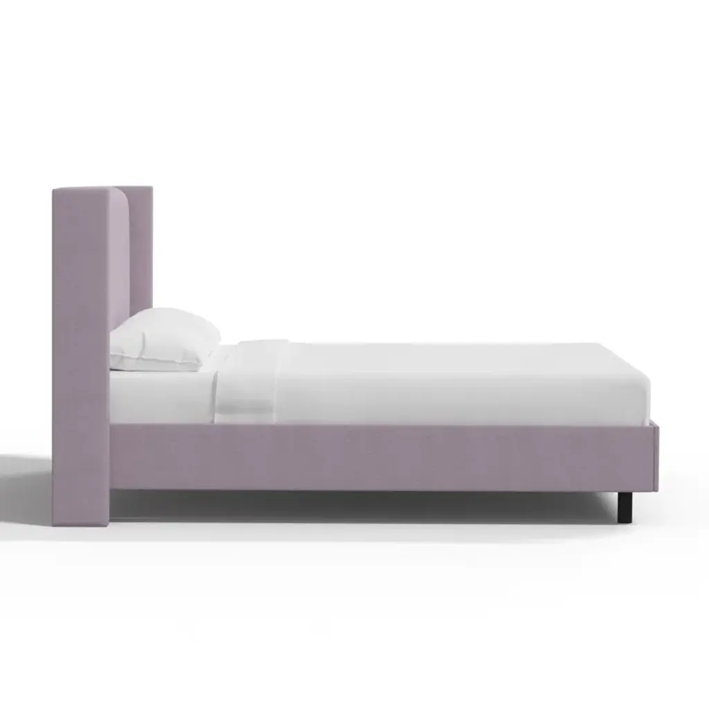 This platform bed brings a clean, transitional vibe to your bedroom. The wingback headboard and upholstered frame are padded for added comfort. Available in a variety of fabric and hue options, it allows you to choose a style that fits your space. The slatted base provides sturdy support, eliminating the need for a box spring. Mattress sold separately.