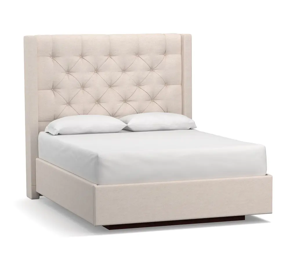 An updated take on a sheltering wingback, ourHarper Tufted Upholstered Tall Storage Bed creates a cozy backdrop for layered bedding and pillows. The double row of nailhead trim accentuates the lofty scale of this statement piece, and generous storage adds functionality while opening up the floor space in a room.