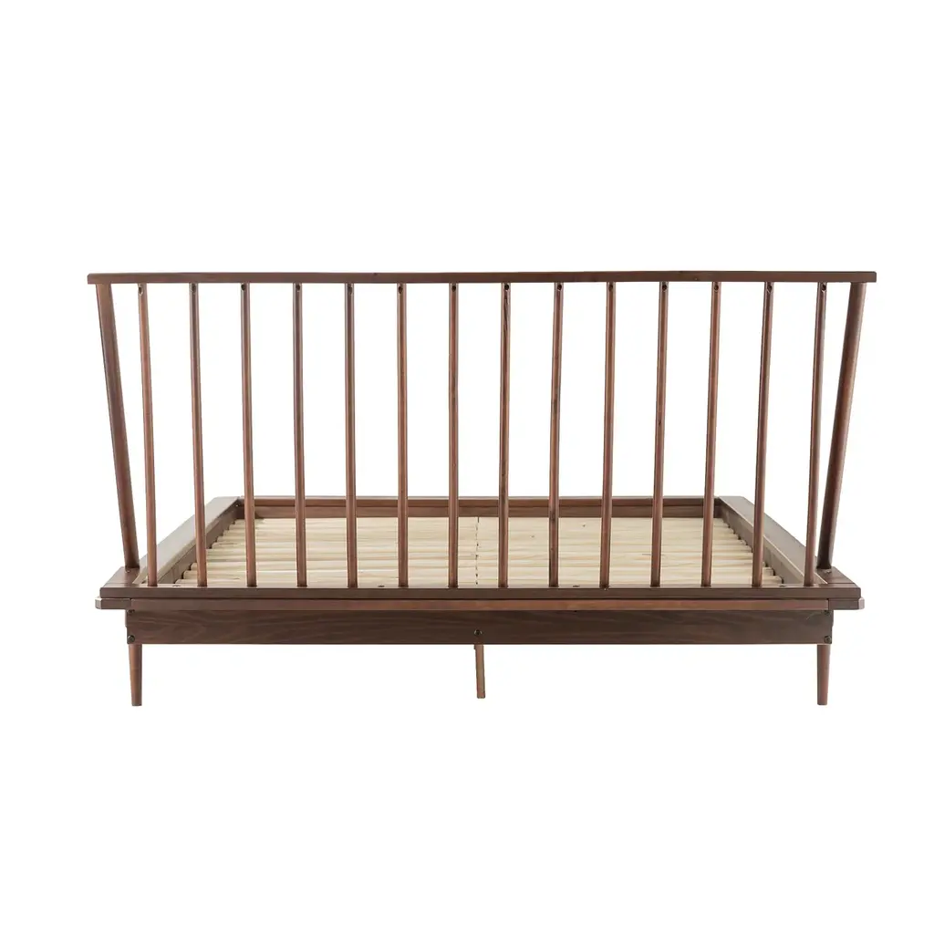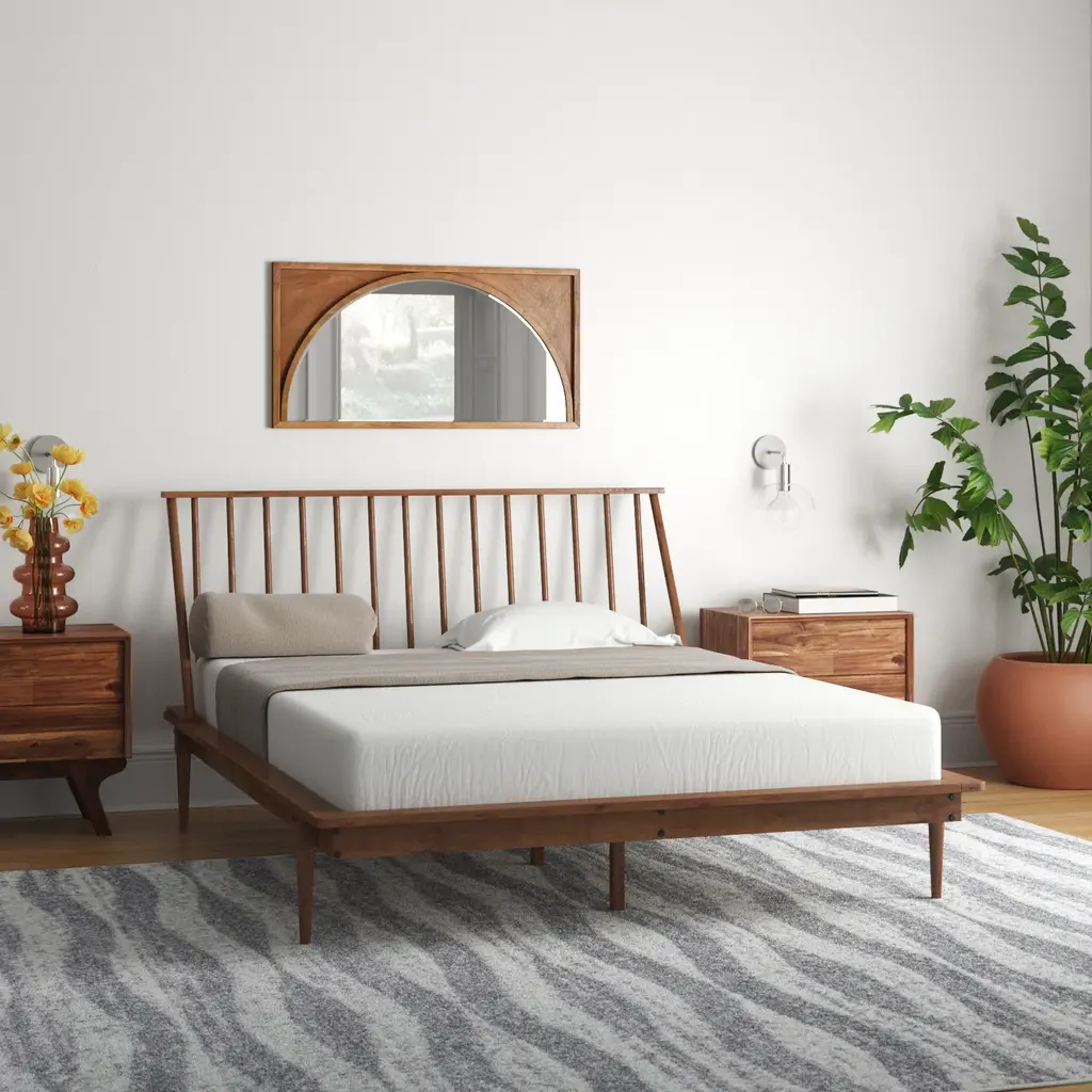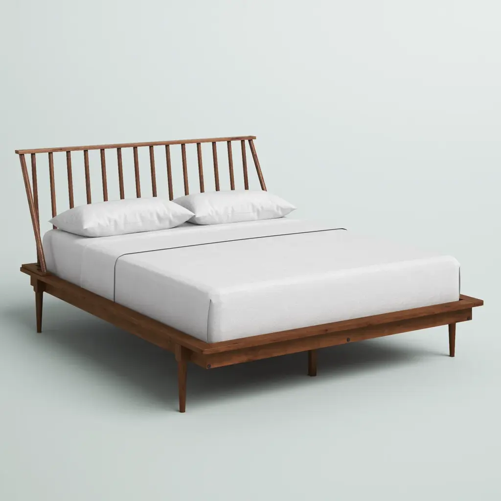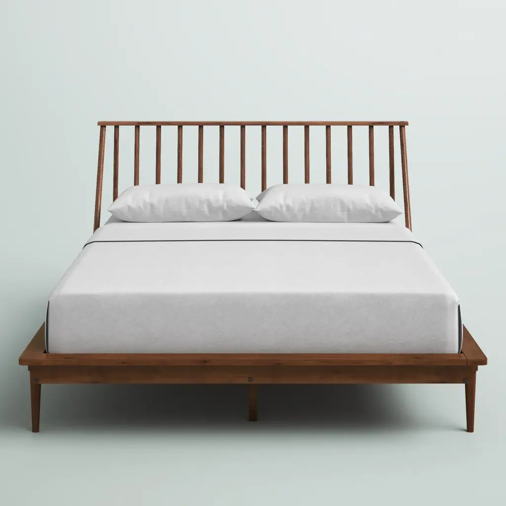 About This Product Elevate your bedroom with this mid-century modern bed, featuring a clean-lined spindle headboard and tapered legs for that perfect retro look. Made from solid pine wood, this platform bed offers sturdy support without the need for a box spring. Mattress and bedding are not included. Assembly is a breeze with the included step-by-step instructions, giving your room an instant update. Features Elegant spindle headboard: The clean-lined spindle design of the headboard offers a minimalist yet stylish aesthetic Tapered legs for mid century look: Tapered legs give the bed a distinctive mid-century modern vibe Solid pine wood frame: Built from solid pine wood for a sturdy and long-lasting construction Platform design: No box spring is required, making it a simple and functional option for your bedroom Mattress not included: Please note that mattress and bedding are sold separately Hassle free assembly: Ships ready-to-assemble with clear instructions for easy setup