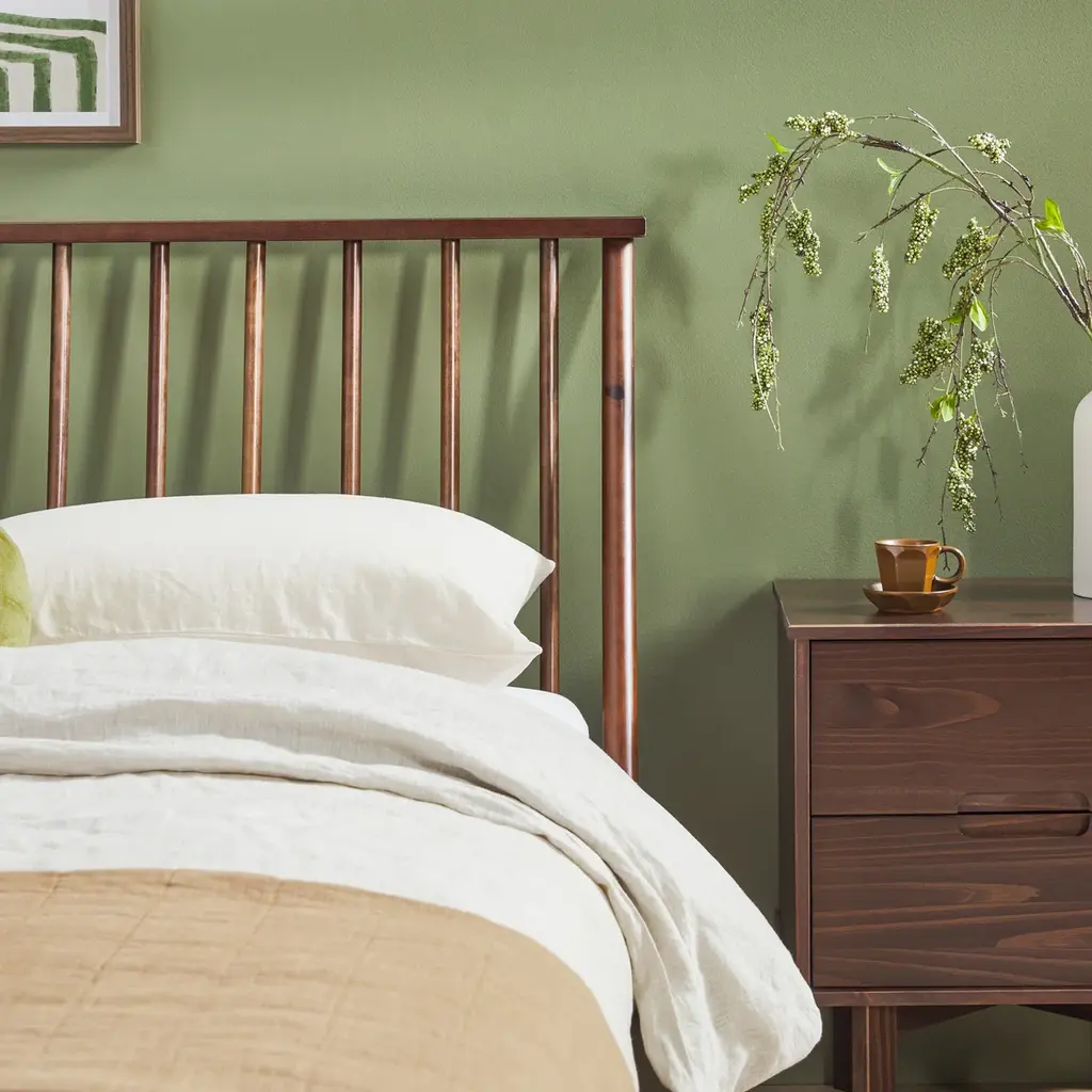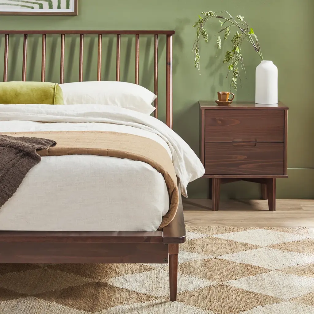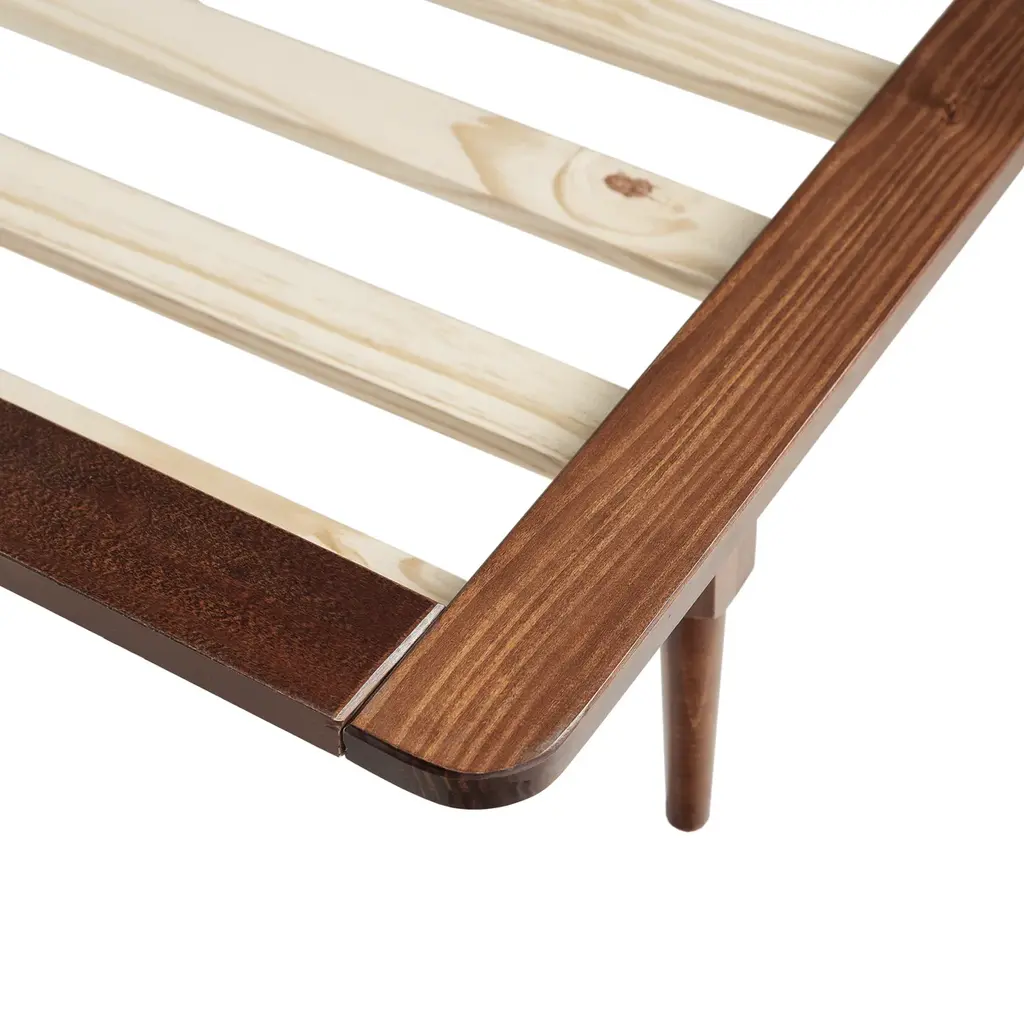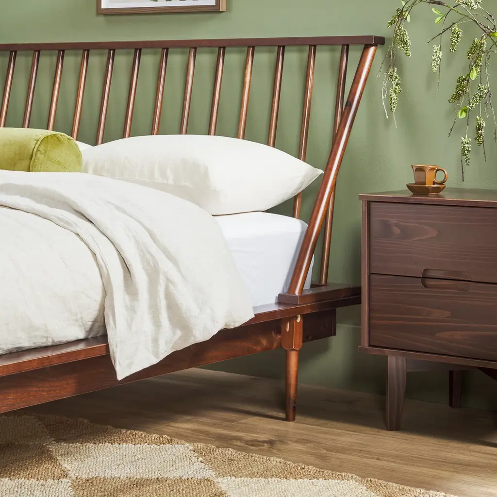 About This Product Elevate your bedroom with this mid-century modern bed, featuring a clean-lined spindle headboard and tapered legs for that perfect retro look. Made from solid pine wood, this platform bed offers sturdy support without the need for a box spring. Mattress and bedding are not included. Assembly is a breeze with the included step-by-step instructions, giving your room an instant update. Features Elegant spindle headboard: The clean-lined spindle design of the headboard offers a minimalist yet stylish aesthetic Tapered legs for mid century look: Tapered legs give the bed a distinctive mid-century modern vibe Solid pine wood frame: Built from solid pine wood for a sturdy and long-lasting construction Platform design: No box spring is required, making it a simple and functional option for your bedroom Mattress not included: Please note that mattress and bedding are sold separately Hassle free assembly: Ships ready-to-assemble with clear instructions for easy setup