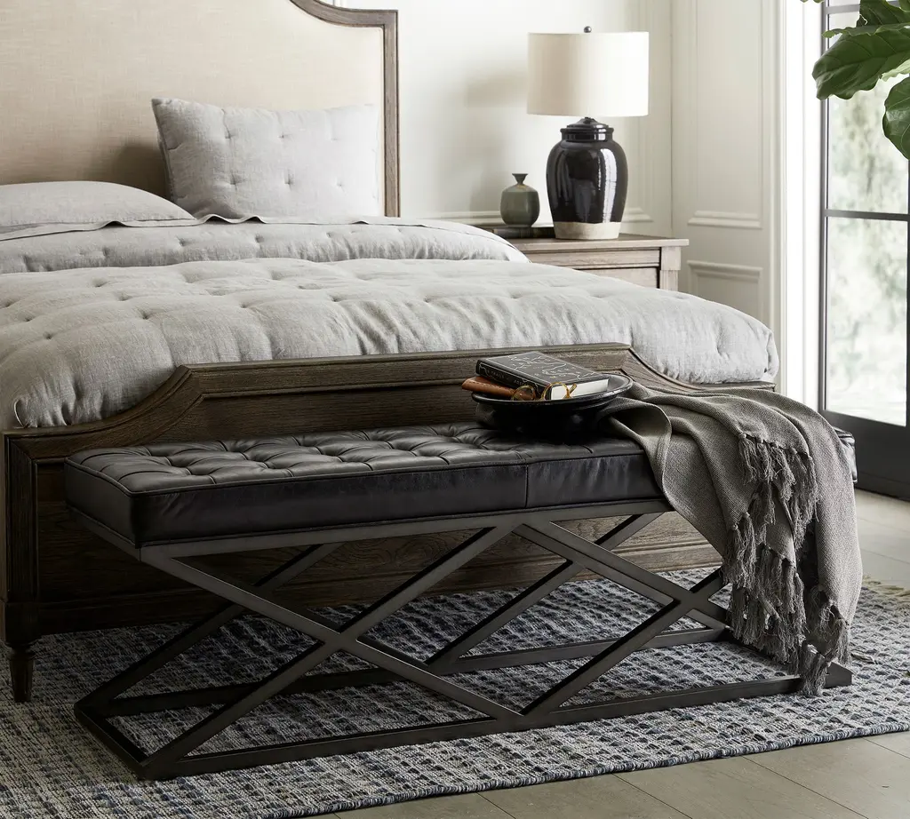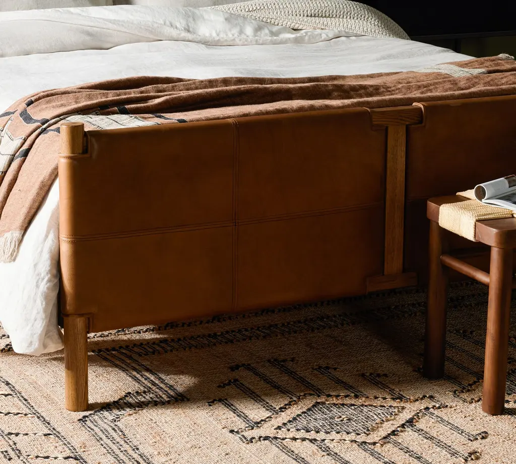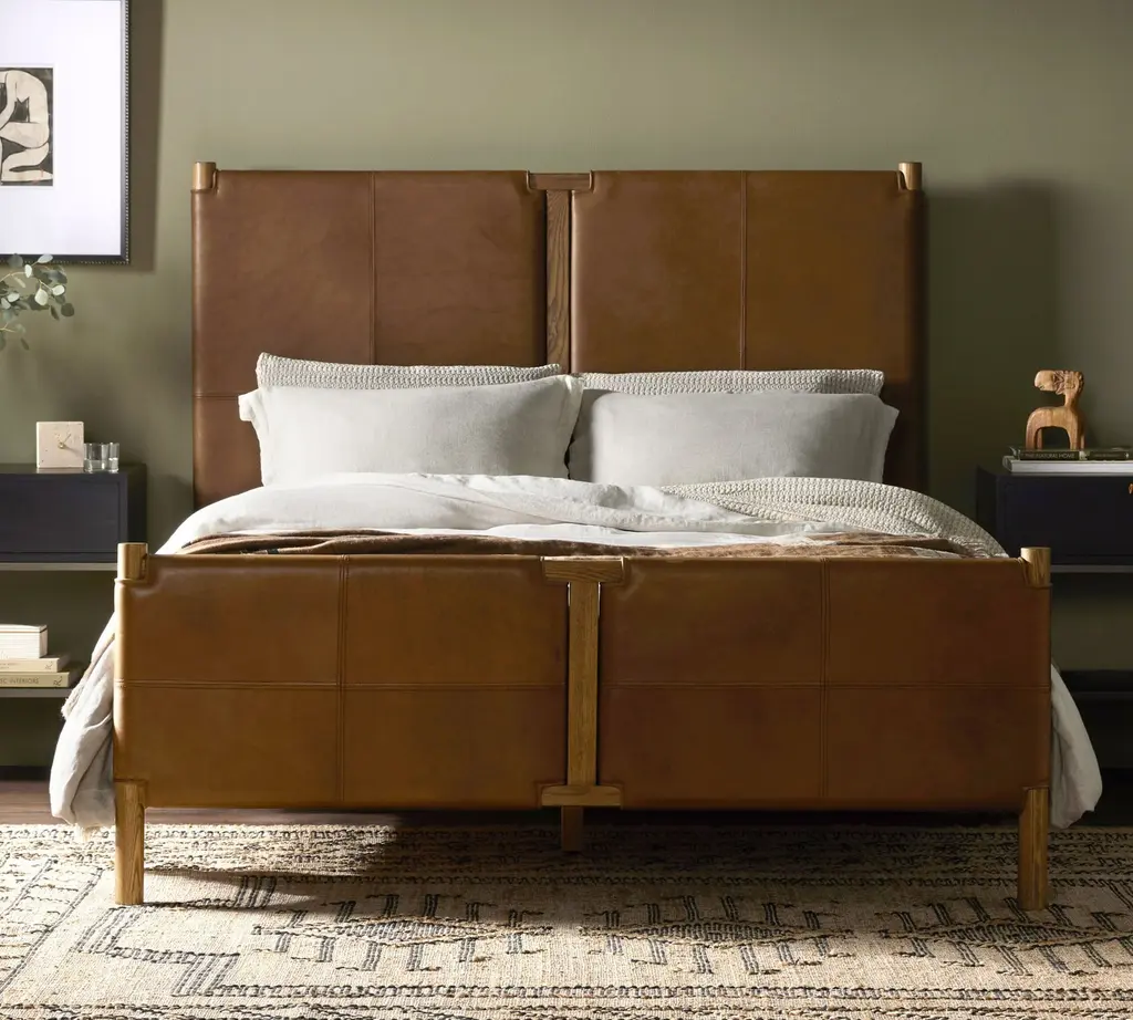 Upcycled supple leather (sourced from a family-owned Italian tannery) has a buttery depth of color and rich, lived-in look. The patchwork design and solid wood frame capture the spirit of a Big Sky lodge — a reason for adding faux shearling throws and relaxed linen pillows to the mix.