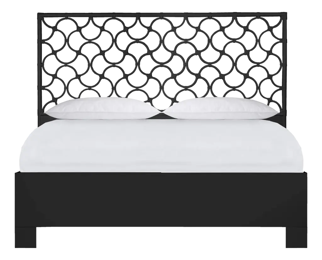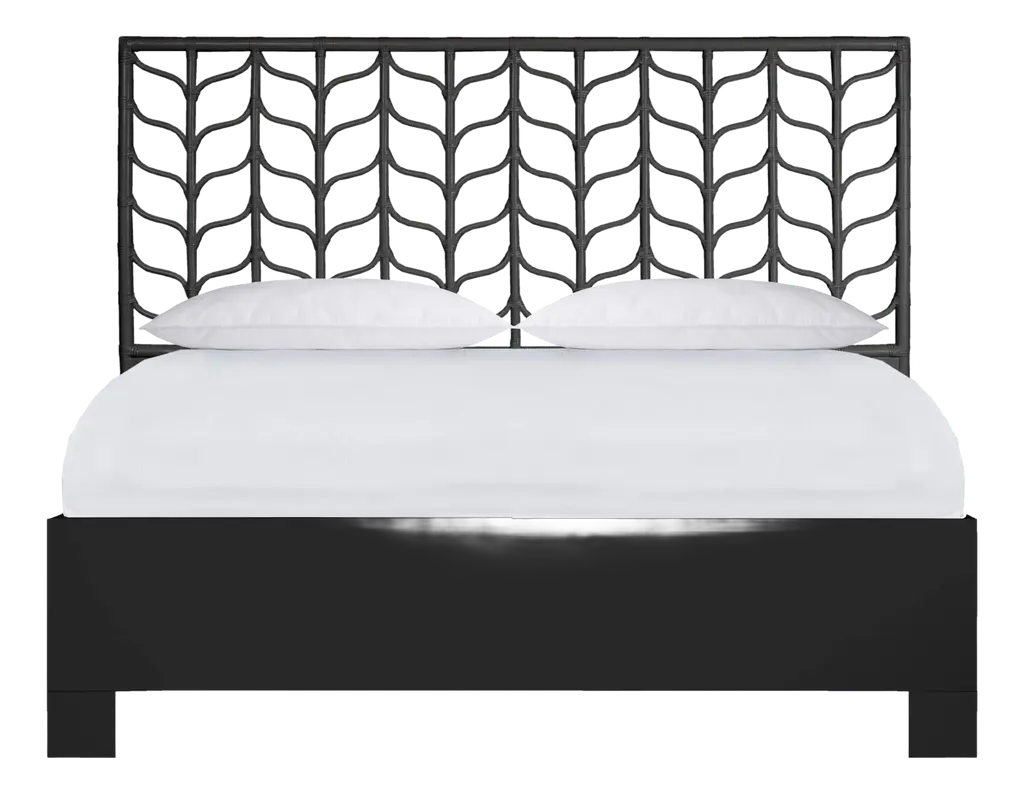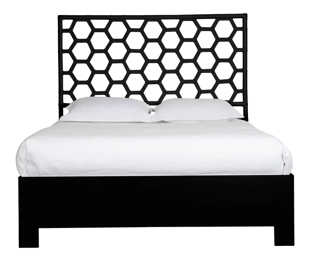 Add a touch of modern charm to your bedroom with the beautifully crafted Honeycomb bed. Handcrafted from natural rattan and meticulously wrapped with leather bindings at each joint, this David Francis Furniture design is a true statement piece. The platform maple bed frame is designed to accept a mattress only. Elevate your space with a bed that not only enhances your room but also reflects your unique style. This piece is made to order, so please allow time for delivery.