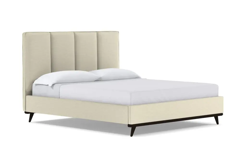 The Jana Black Queen Upholstered Platform Bed is a modern, fabric-based bed designed for the bedroom. Its charcoal color and 100% polyester material content add a touch of elegance and comfort.