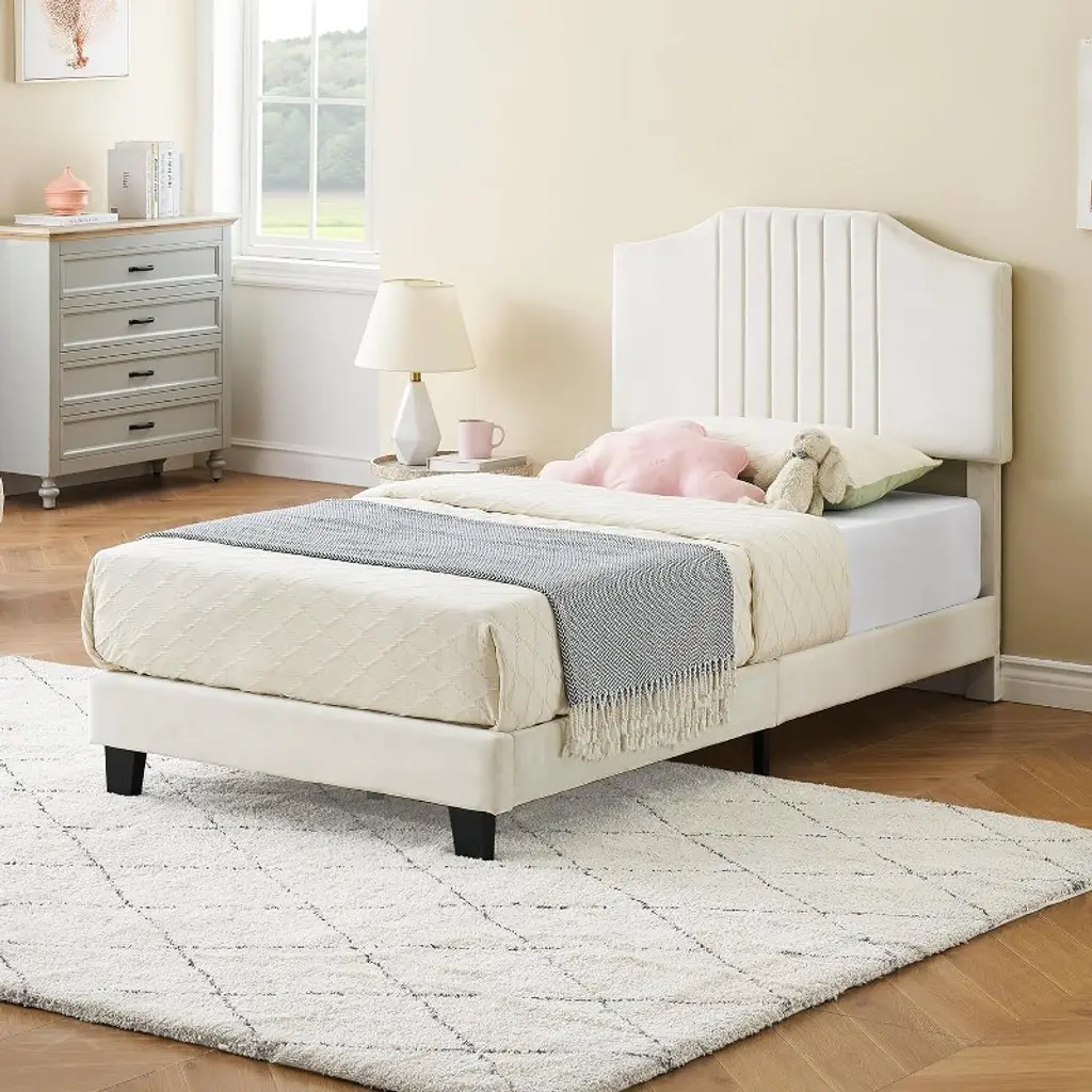 Create a cozy and stylish sleep space for your child with the AOILE Kids Twin Bed Frame, featuring a velvet-upholstered headboard and a sturdy noise-free structure. The soft, padded design offers comfort and safety, while the non-slip bed slats keep the mattress firmly in place—no box spring required. Designed for easy assembly, this twin-size bed frame is ideal for kids' bedrooms, guest rooms, or dorms. The low-profile platform ensures safe climbing for young sleepers, and the soundproofed frame guarantees a quiet, restful night.