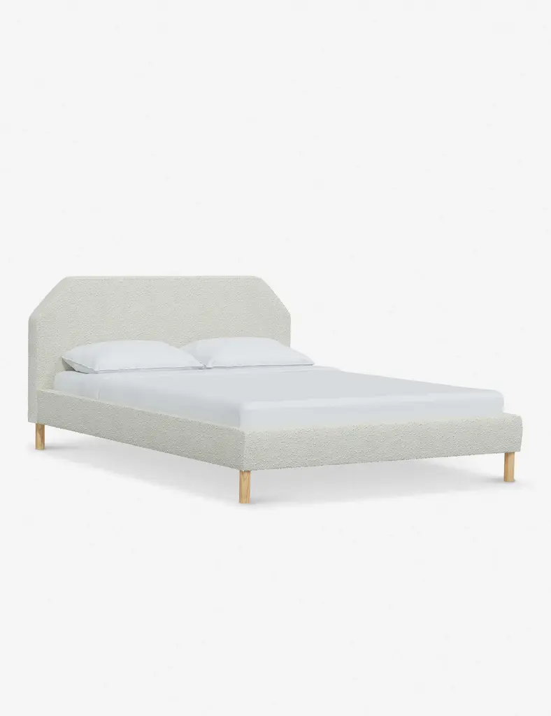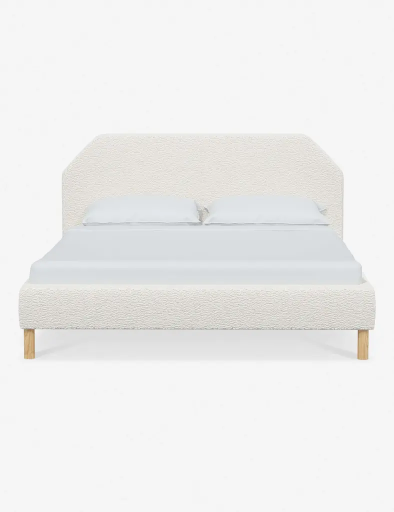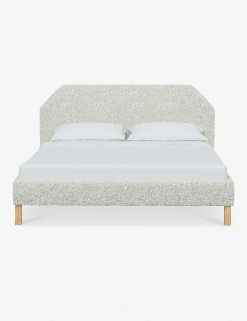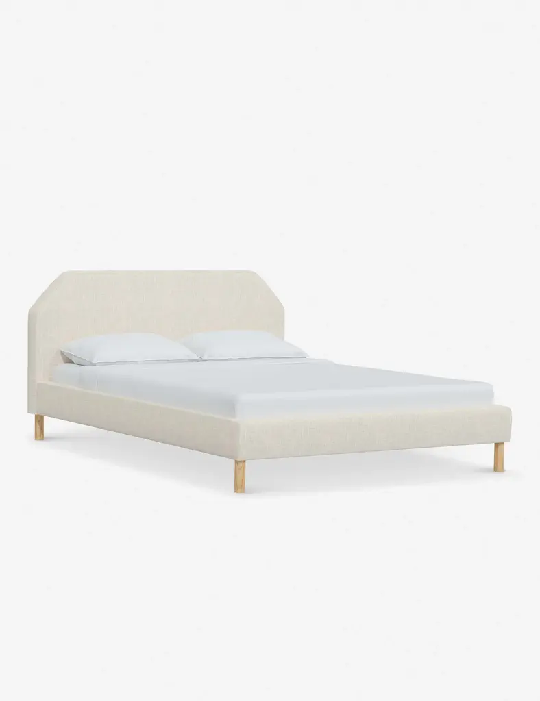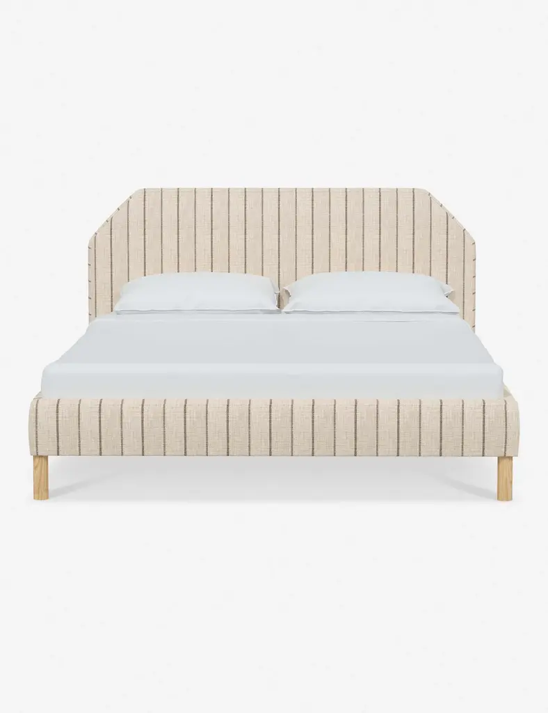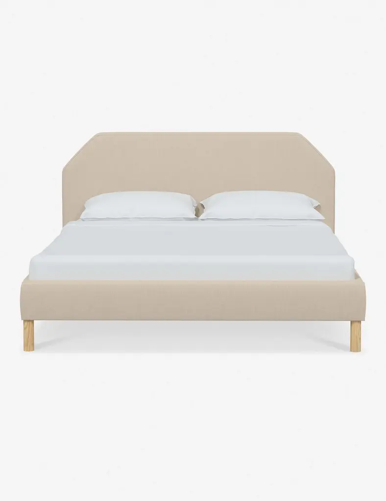 Geometric lines set off a streamlined, modern silhouette in this exclusive bed frame with headboard design tailored for versatile styling potential. This platform bed is raised from the ground with bare, pinewood legs and trimly upholstered from footboard to headboard to offer your space a fresh focal point that will transform your look.