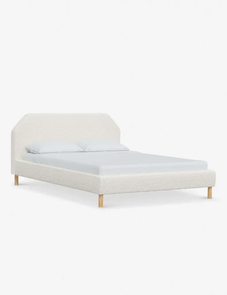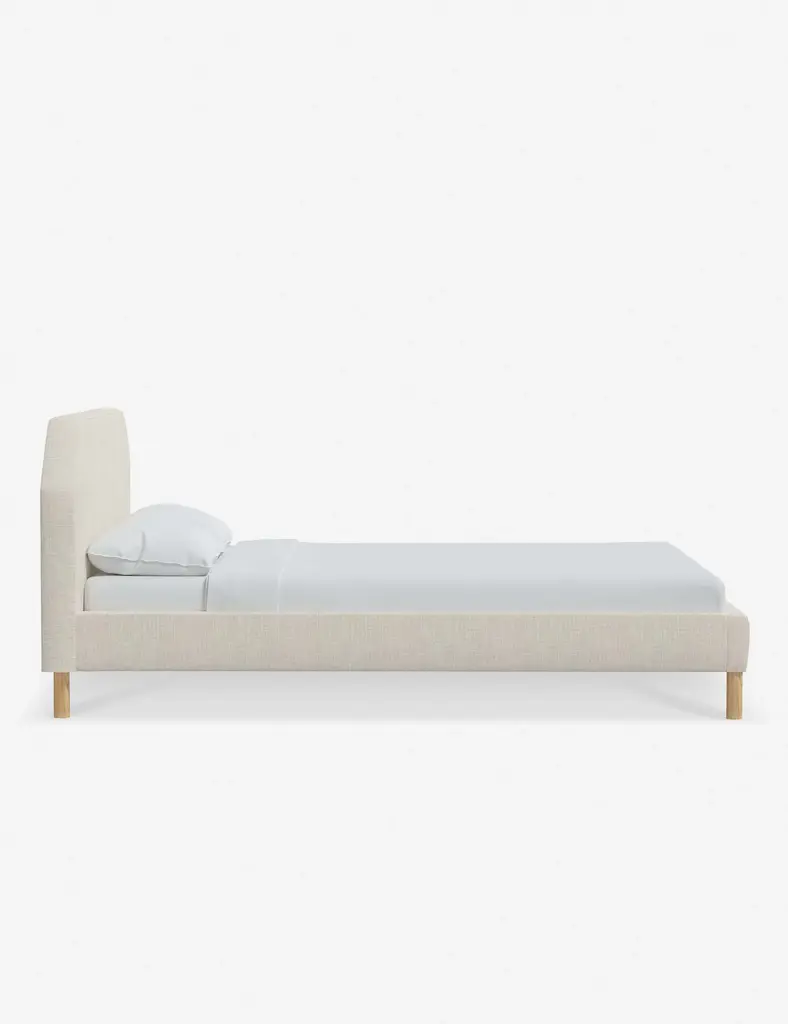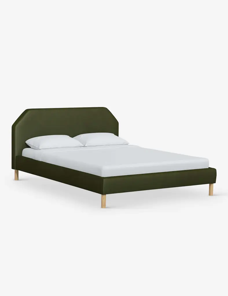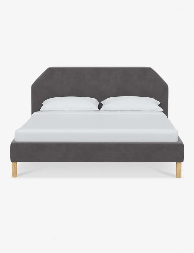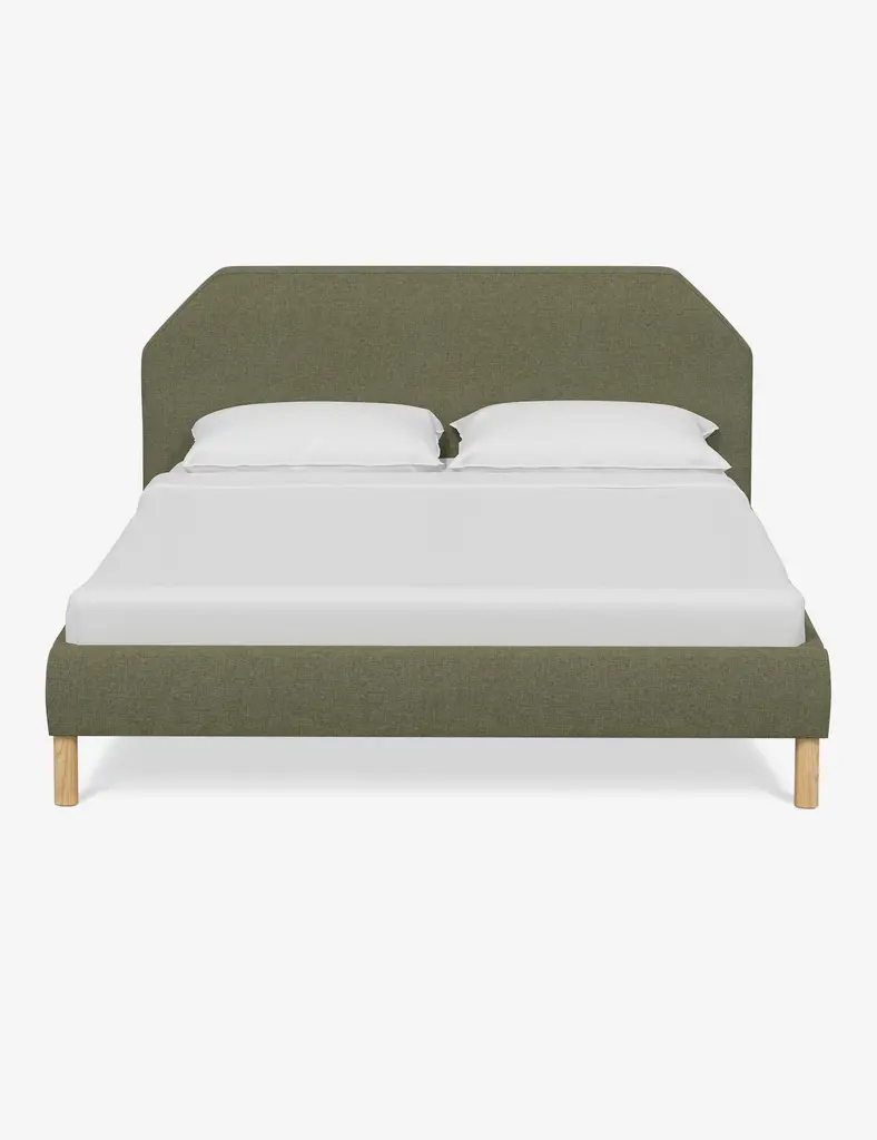 Geometric lines set off a streamlined, modern silhouette in this exclusive bed frame with headboard design tailored for versatile styling potential. This platform bed is raised from the ground with bare, pinewood legs and trimly upholstered from footboard to headboard to offer your space a fresh focal point that will transform your look.