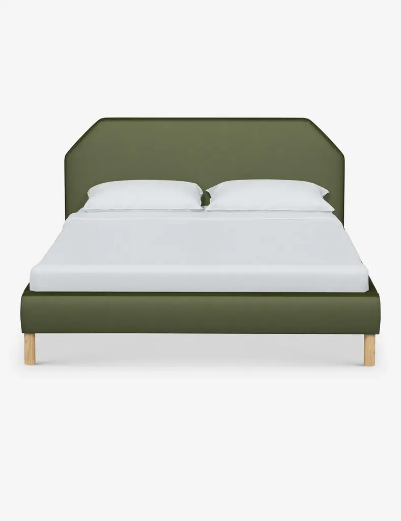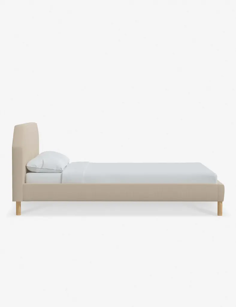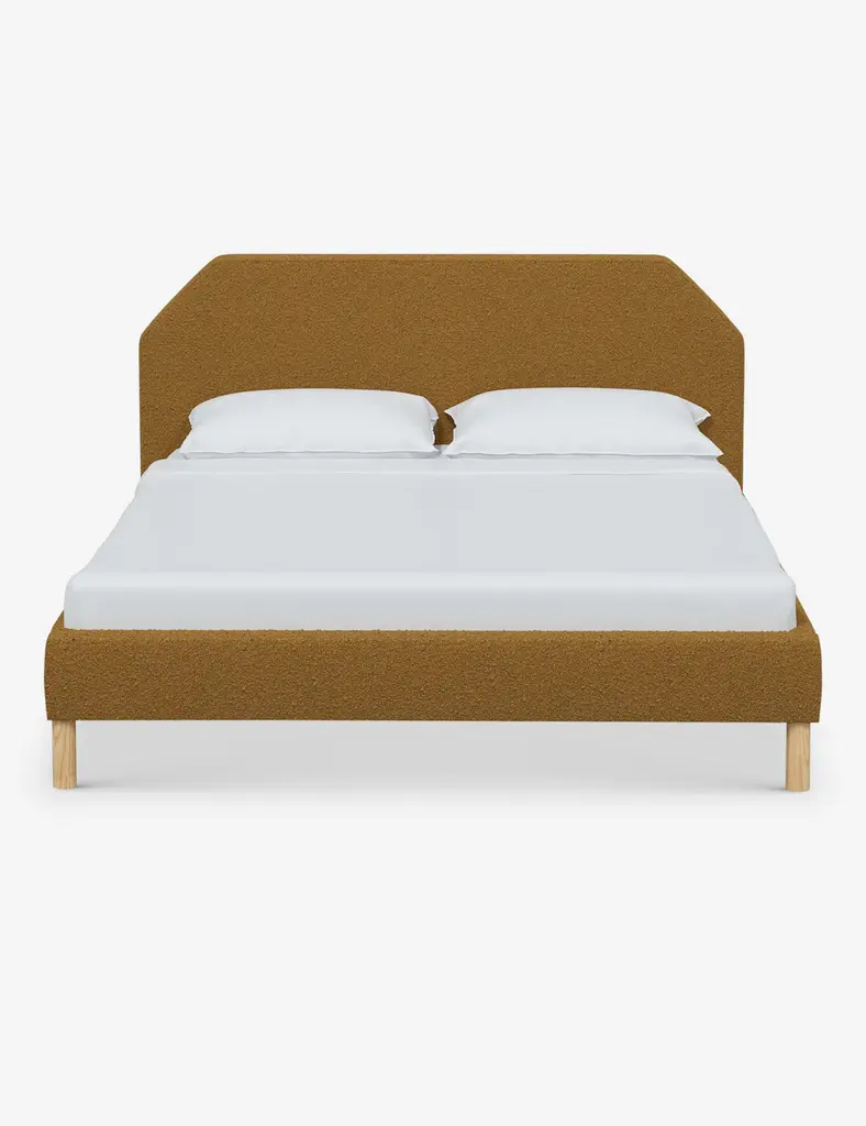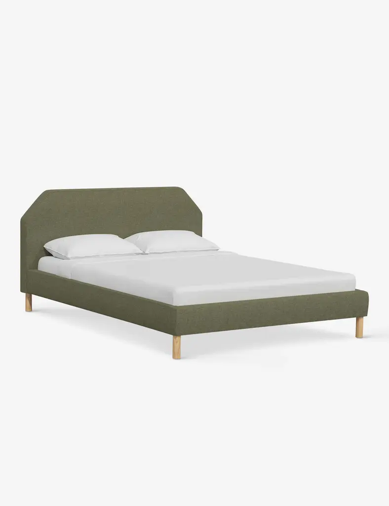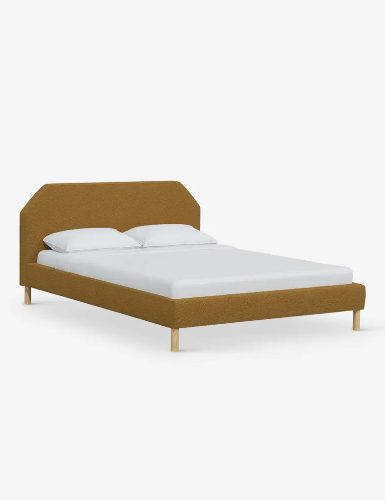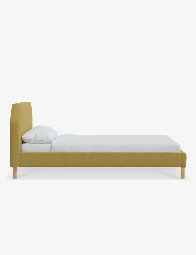 Geometric lines set off a streamlined, modern silhouette in this exclusive bed frame with headboard design tailored for versatile styling potential. This platform bed is raised from the ground with bare, pinewood legs and trimly upholstered from footboard to headboard to offer your space a fresh focal point that will transform your look.