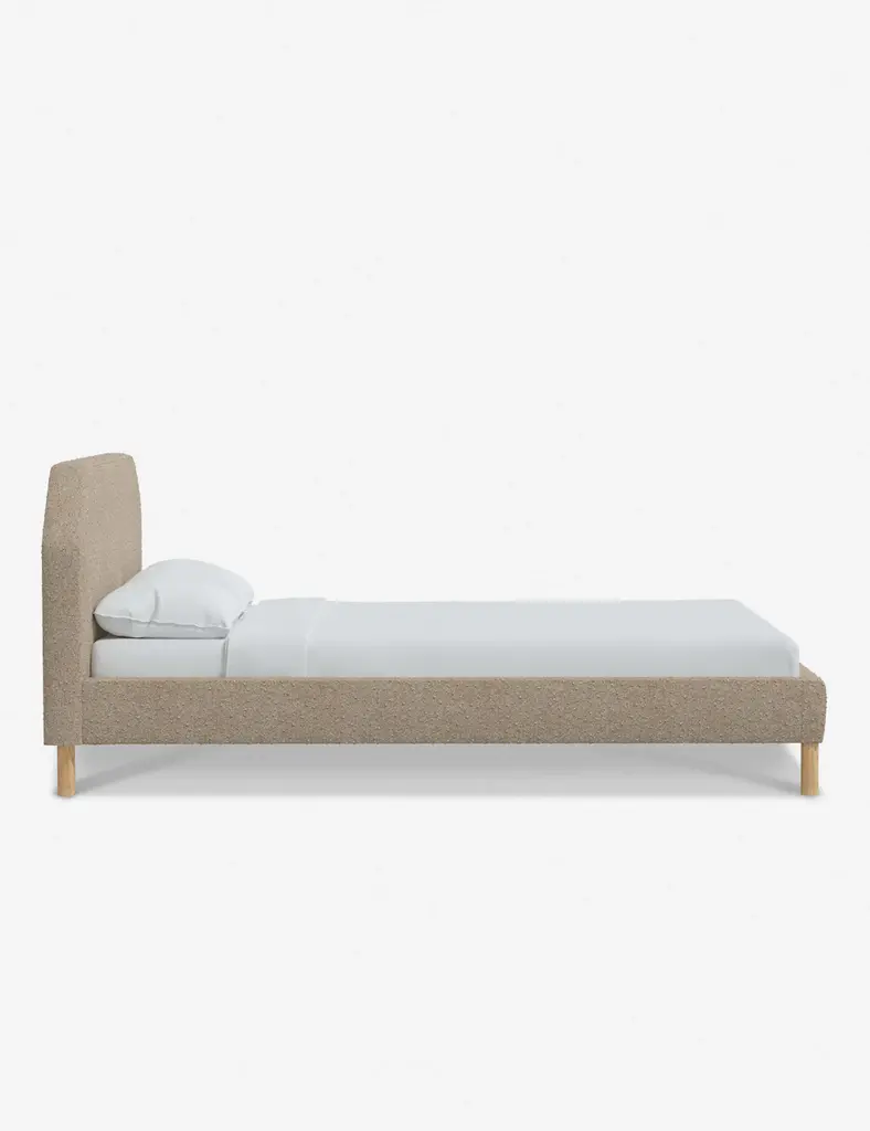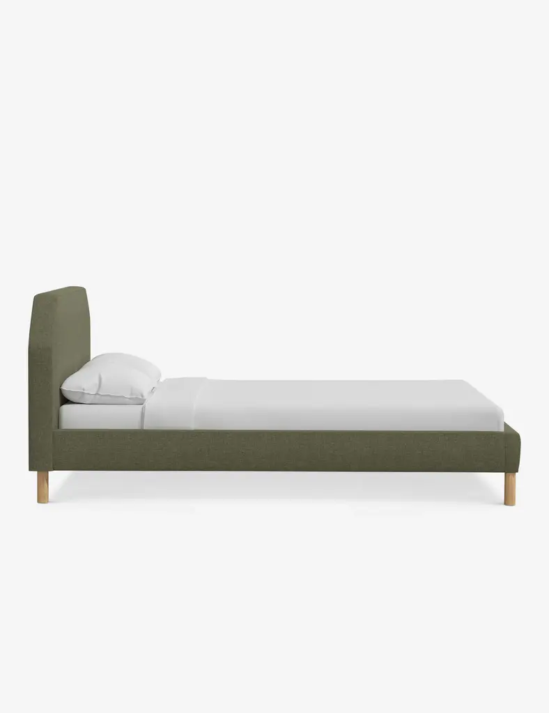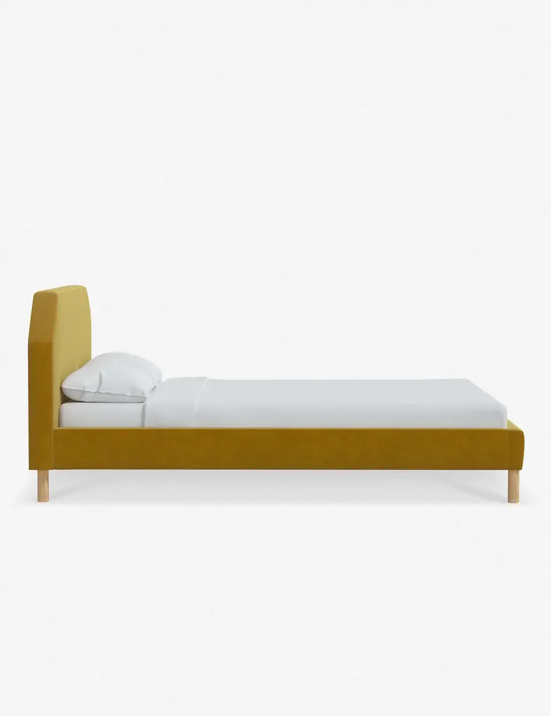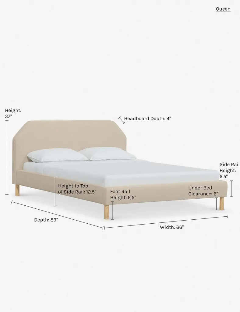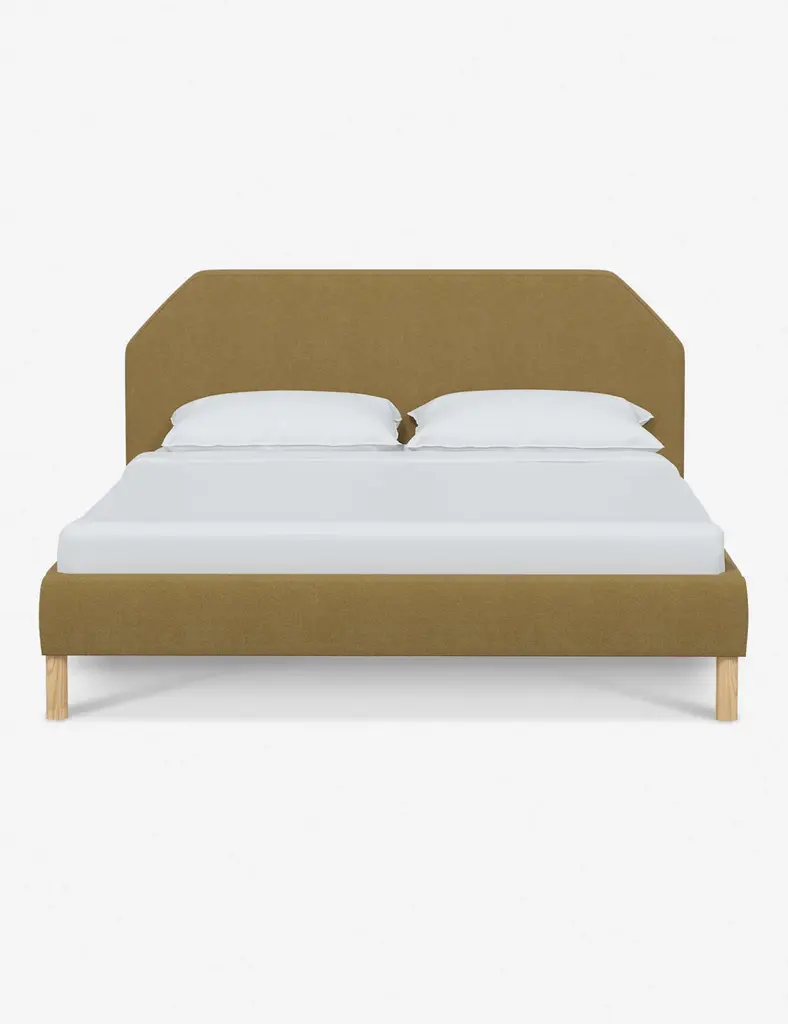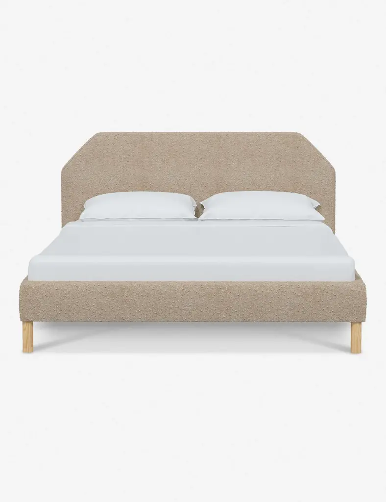 Geometric lines set off a streamlined, modern silhouette in this exclusive bed frame with headboard design tailored for versatile styling potential. This platform bed is raised from the ground with bare, pinewood legs and trimly upholstered from footboard to headboard to offer your space a fresh focal point that will transform your look.