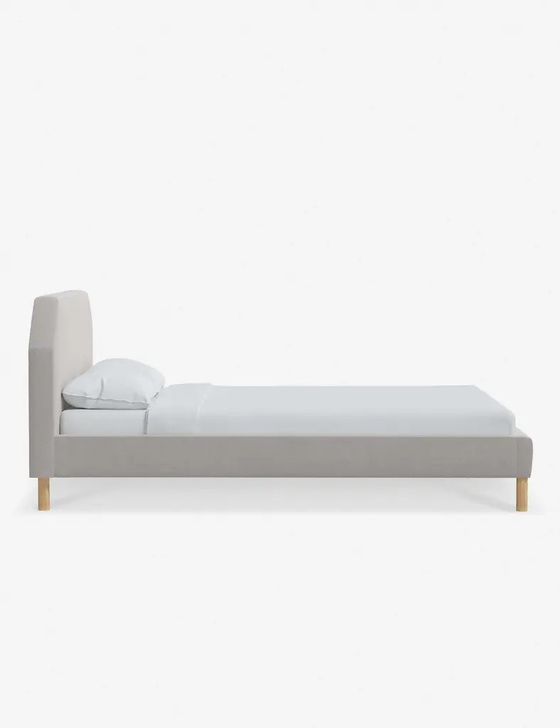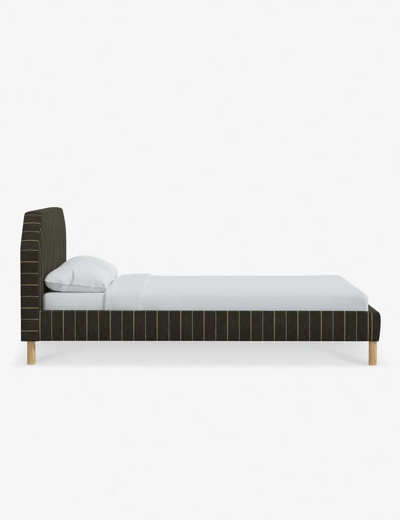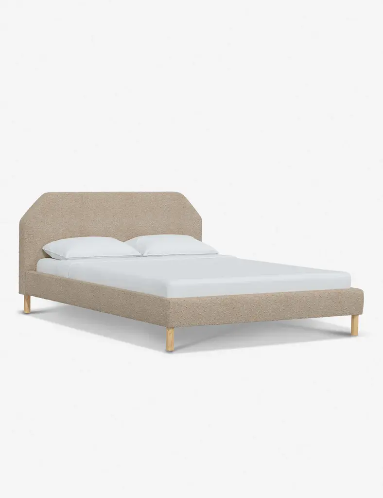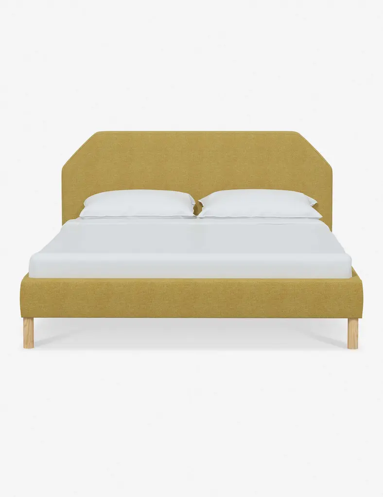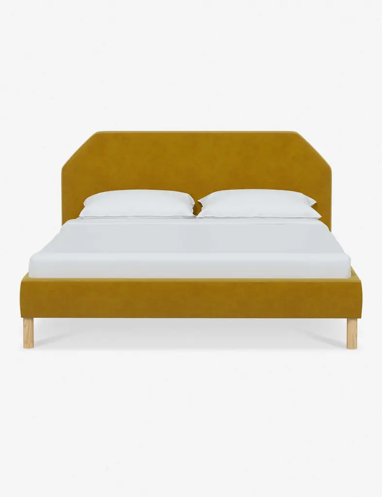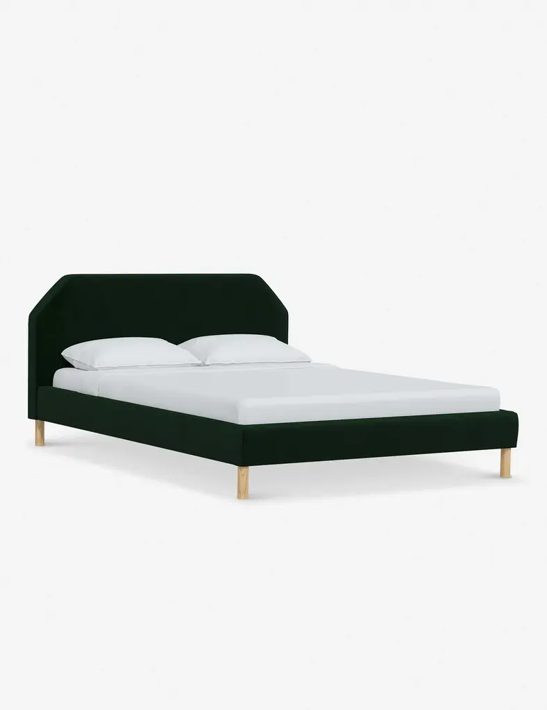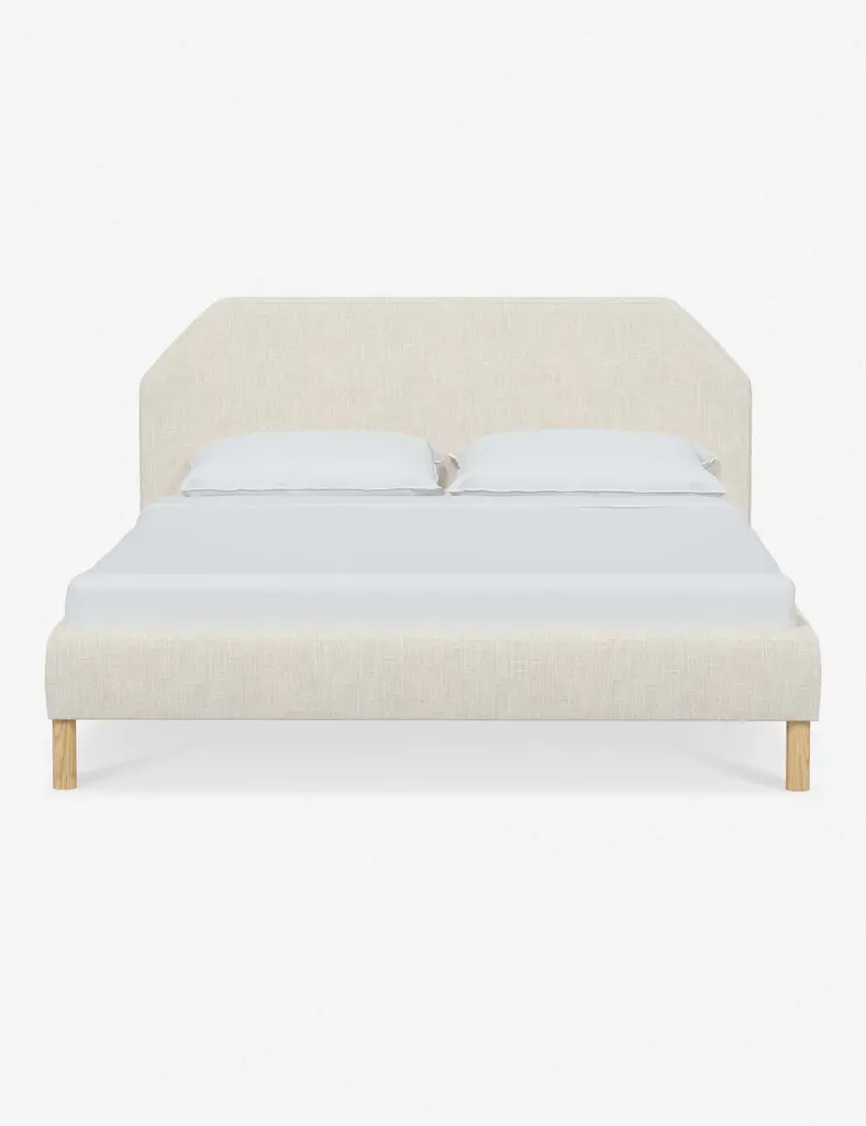 Geometric lines set off a streamlined, modern silhouette in this exclusive bed frame with headboard design tailored for versatile styling potential. This platform bed is raised from the ground with bare, pinewood legs and trimly upholstered from footboard to headboard to offer your space a fresh focal point that will transform your look.