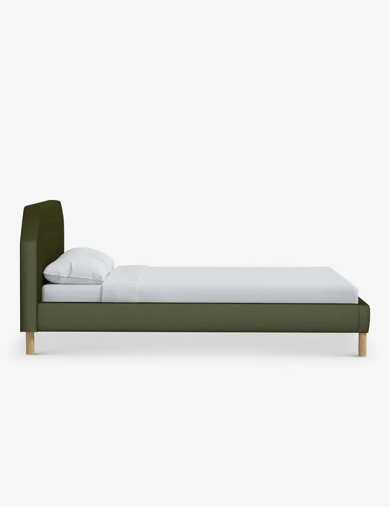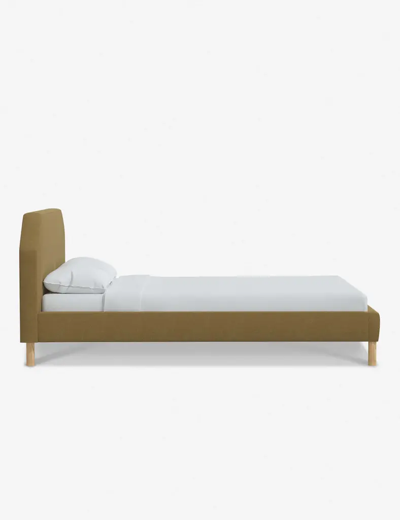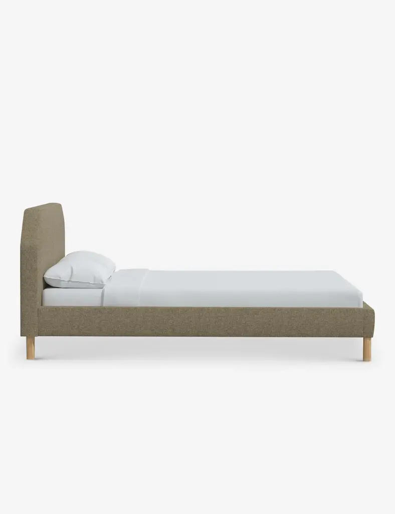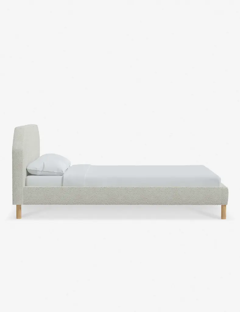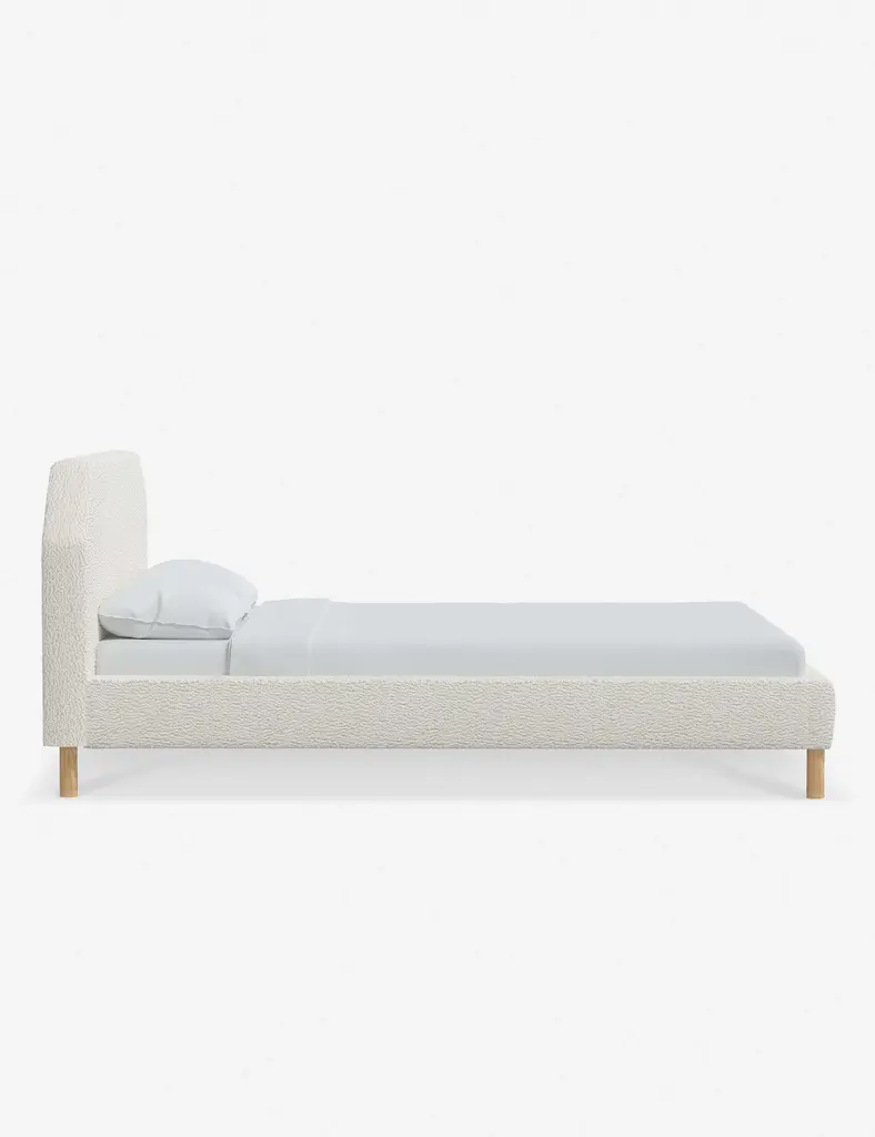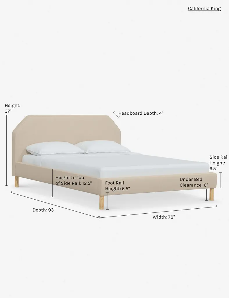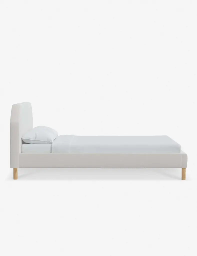 Geometric lines set off a streamlined, modern silhouette in this exclusive bed frame with headboard design tailored for versatile styling potential. This platform bed is raised from the ground with bare, pinewood legs and trimly upholstered from footboard to headboard to offer your space a fresh focal point that will transform your look.