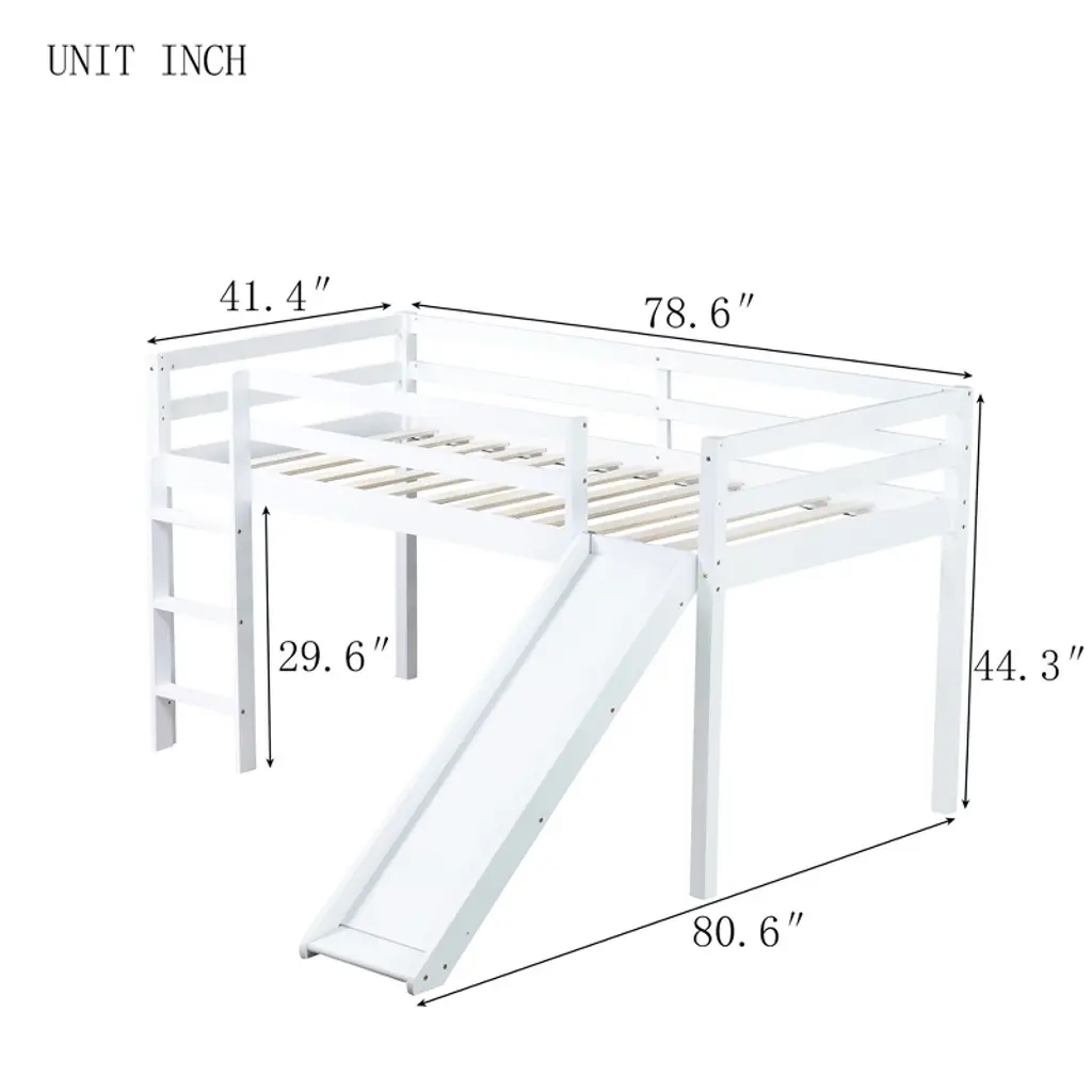 Transform any child's bedroom into a fun, functional space with this low loft bed, featuring an exciting slide that adds a playful twist to bedtime. Crafted from non-toxic, premium rubberwood, this bed offers long-lasting durability and safety for kids and teens. The spacious area beneath the lofted bed is perfect for creating a cozy play area, entertainment zone, or extra storage space for books, toys, or cushions. The built-in ladder and high guardrails ensure easy access and safety, making it ideal for younger children. The minimalist design with a slide and ladder seamlessly blends into any room, offering both a stylish and practical solution for smaller bedrooms. With a weight capacity of 250 lbs and a mattress thickness of 6 inches or less, this low loft bed is designed to meet your child's needs for rest and play while saving valuable space.