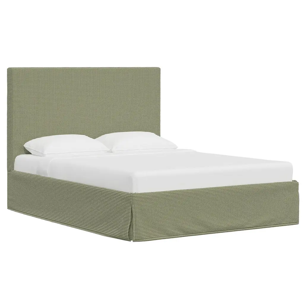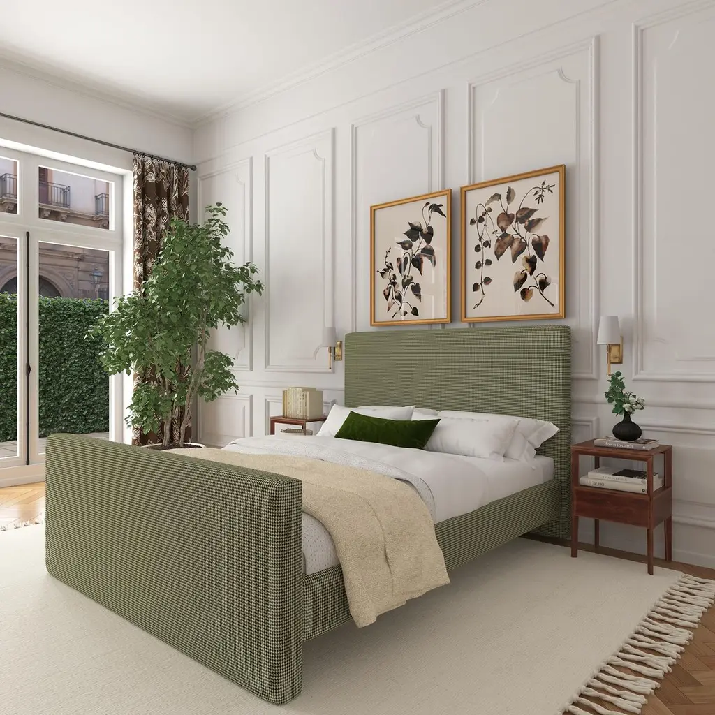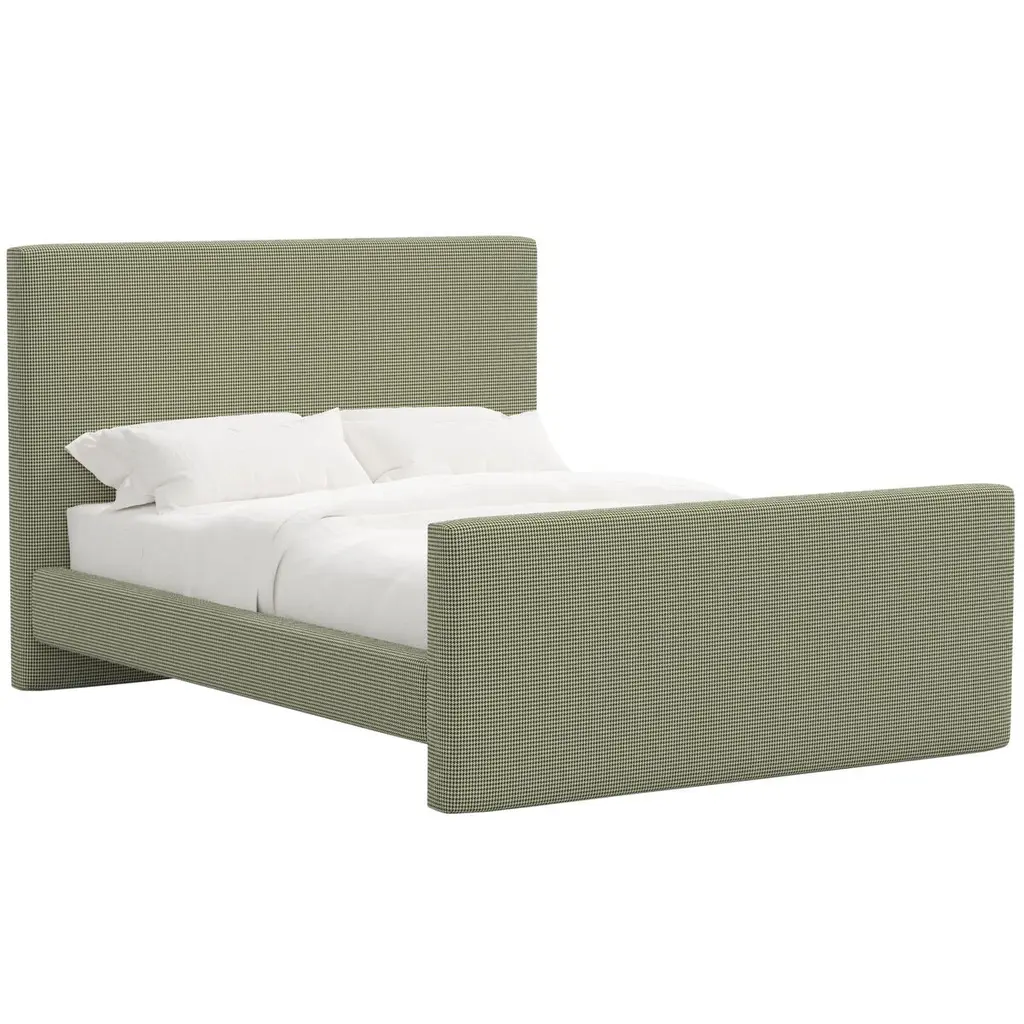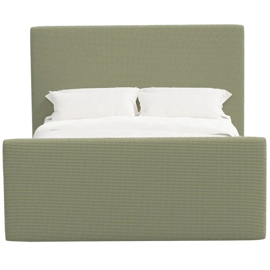 The Lenora platform bed epitomizes understated elegance with its fully upholstered frame and headboard, offering a luxurious yet clean aesthetic in this stunning woven houndstooth fabric. Its open base fosters a cozy yet airy ambiance, while the generous headboard padding ensures lasting comfort for reading or watching TV. Crafted in the USA, this sophisticated silhouette eliminates the need for a box spring with its convenient slat system, marrying style and practicality seamlessly.