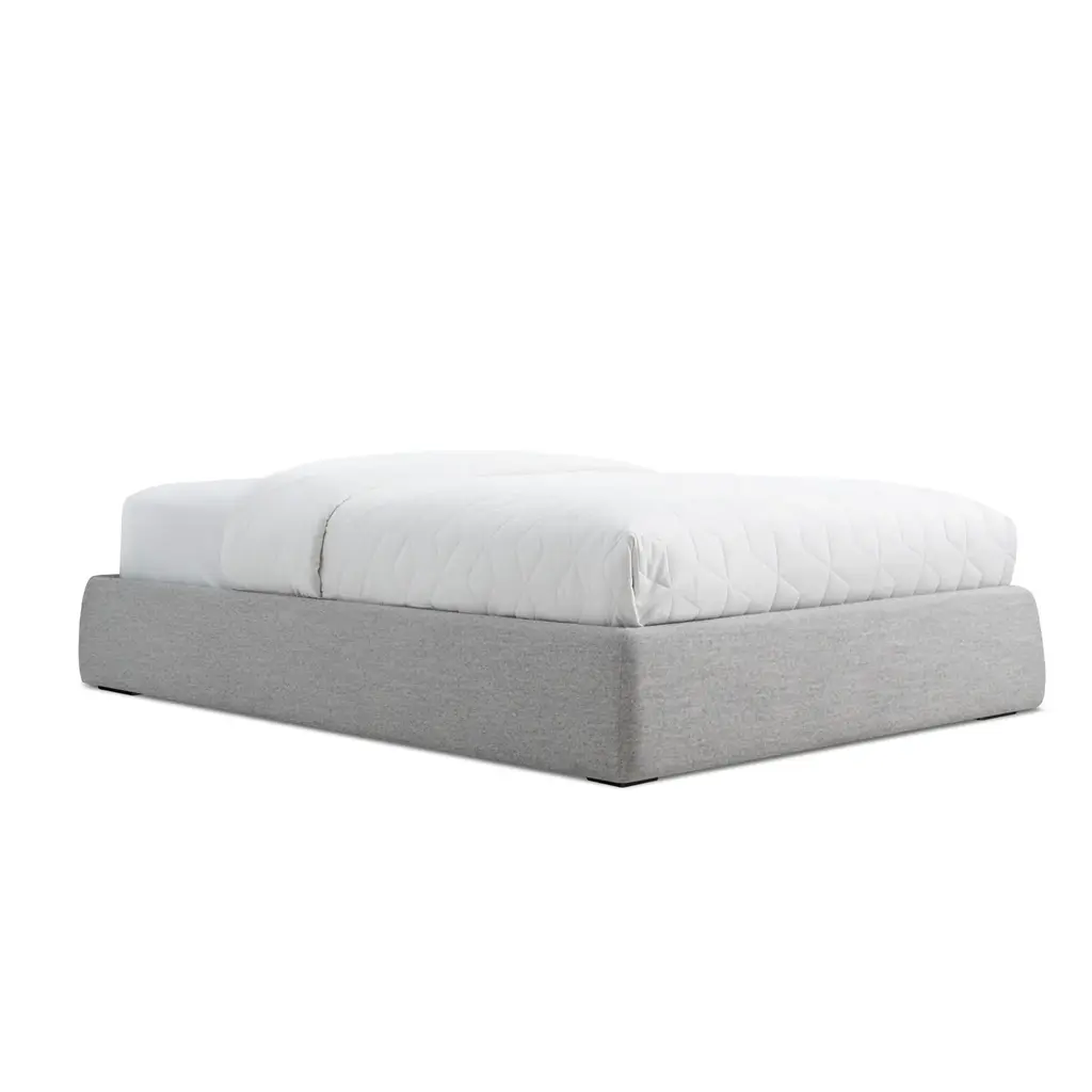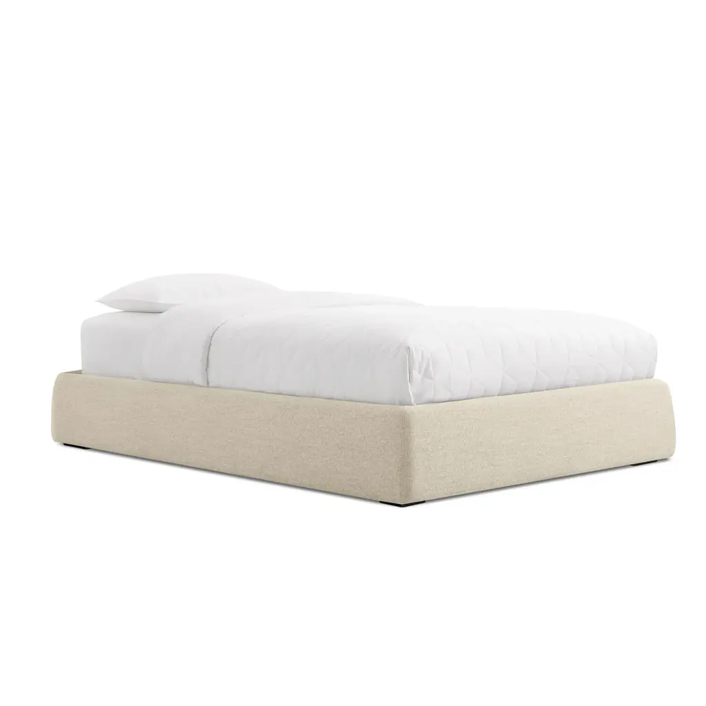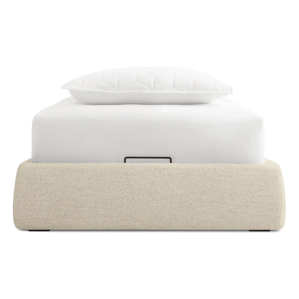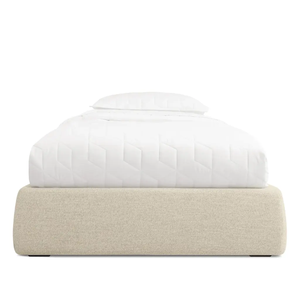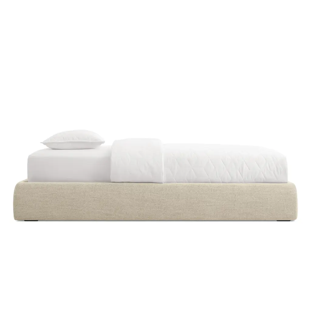 Pragmatic and space saving without being cold and austere, the Lid Platform bed’s gently curved soft padded rails give presence and warmth to a compact sleep solution. With slipcovered upholstery.