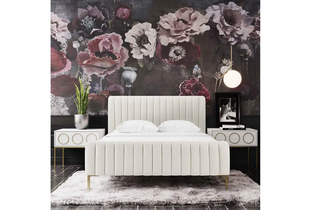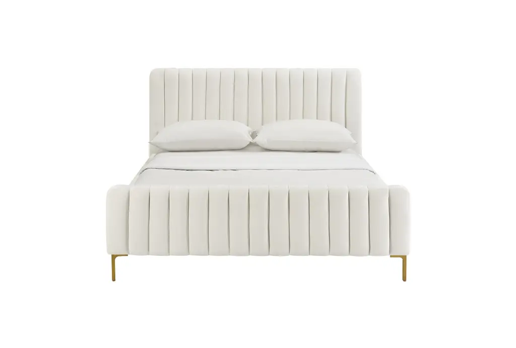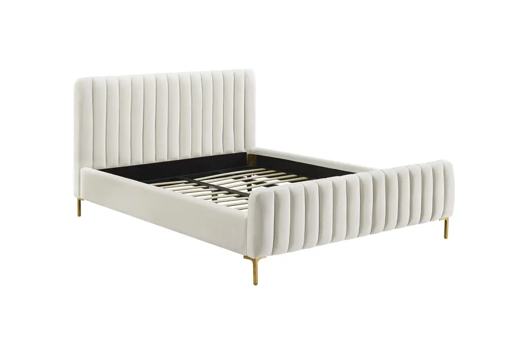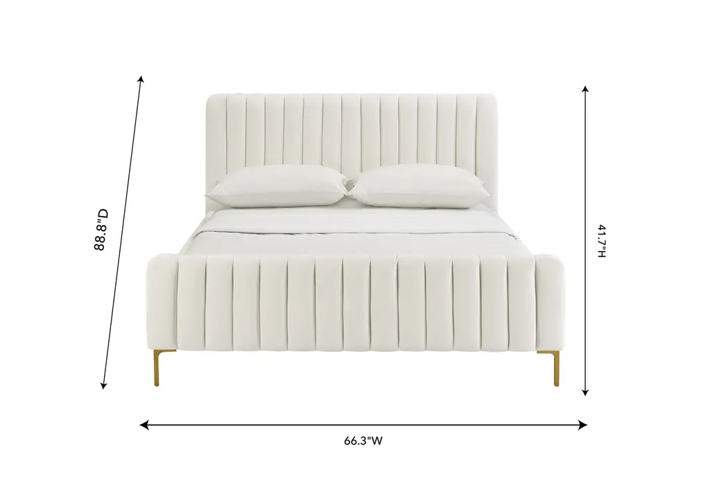 The Lisette Cream Velvet Queen Bed is a contemporary piece, skillfully handmade by furniture craftsmen. Its cream velvet fabric and metal accents make it a stylish addition to any bedroom.