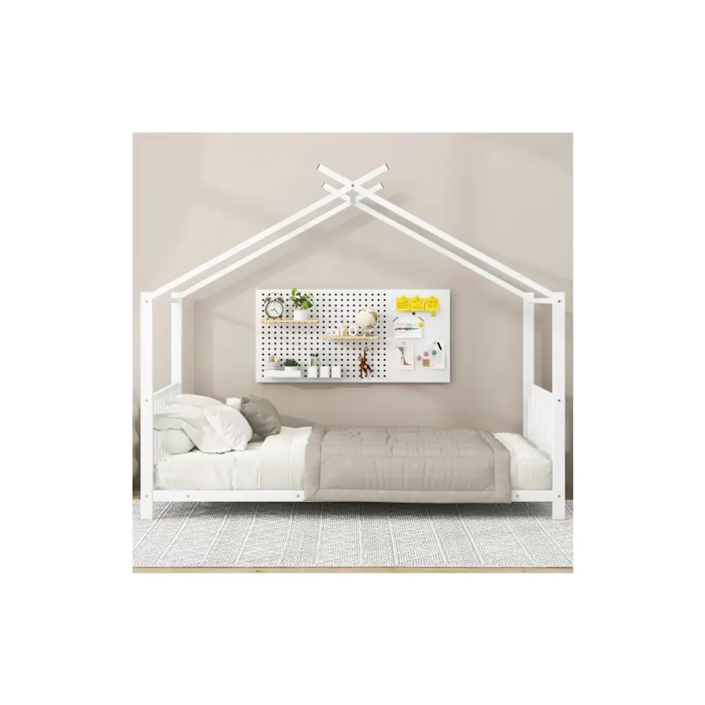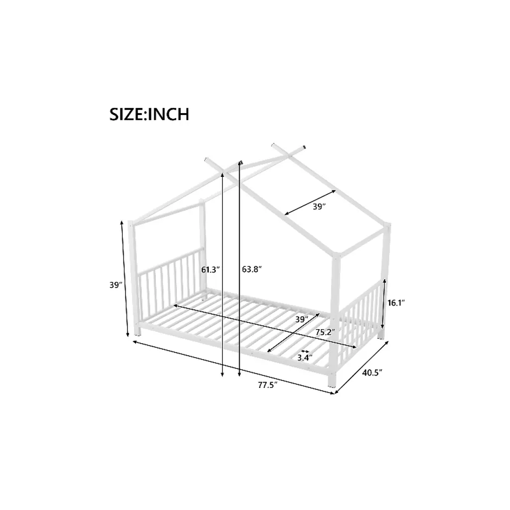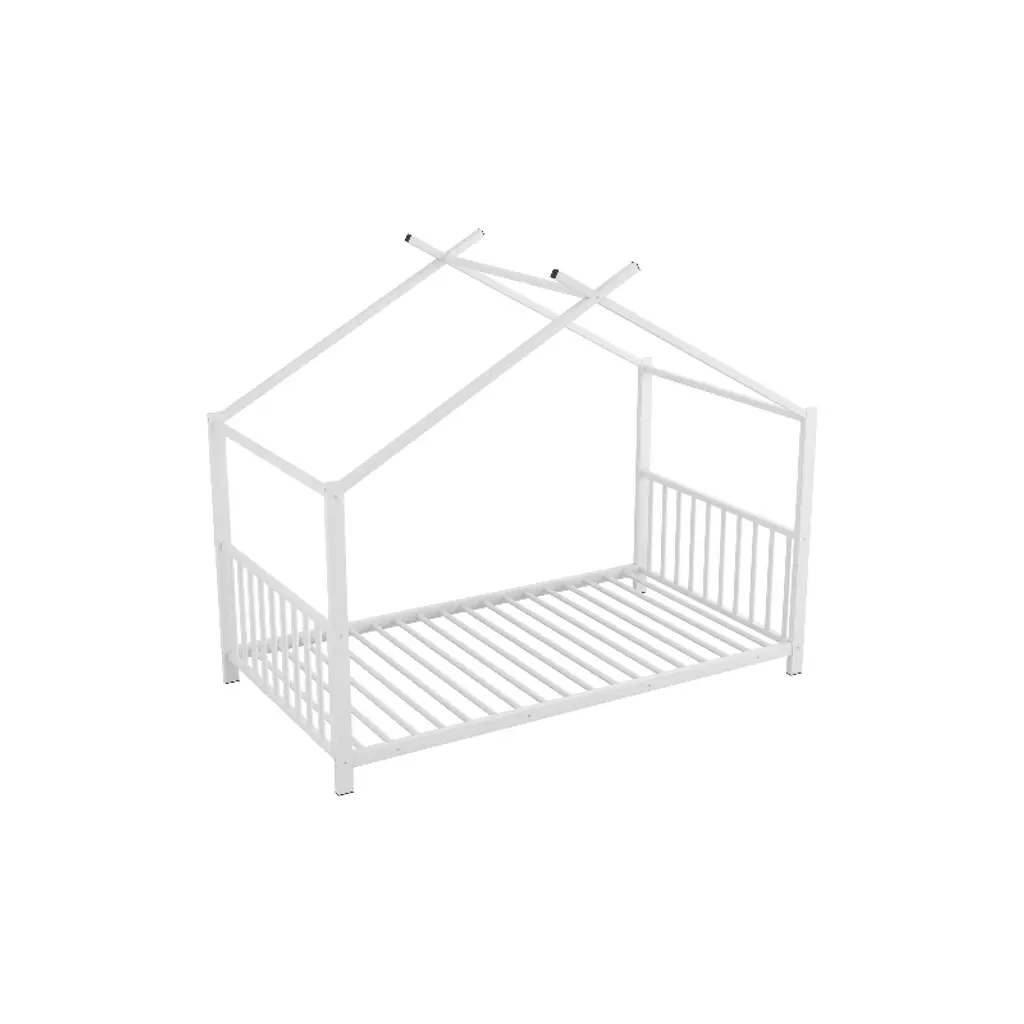 Bring joy and functionality to your child’s bedroom with this Twin Size Metal House Platform Bed Frame— a whimsical, durable Beds with Headboards (in a charming house shape) that blends Montessori charm with practicality, perfect for sleepovers and everyday use. Designed with a classic house roof silhouette, it adds a playful yet timeless spark to any room, and you can decorate it with your child for quality bonding time. Crafted from a solid metal frame with strong metal legs, this Bed Frame offers sound stability (no dangerous wobbling) and reliable load-bearing capacity, withstanding kids’ play and standing the test of time. It includes a slat kit that supports mattresses to prevent sliding, extends mattress life, and eliminates the need for a box spring. With clearly labeled parts, a step-by-step manual, and pre-drilled holes, assembly is straightforward—making this Platform Bed a safe, stylish, and hassle-free addition to your child’s space.