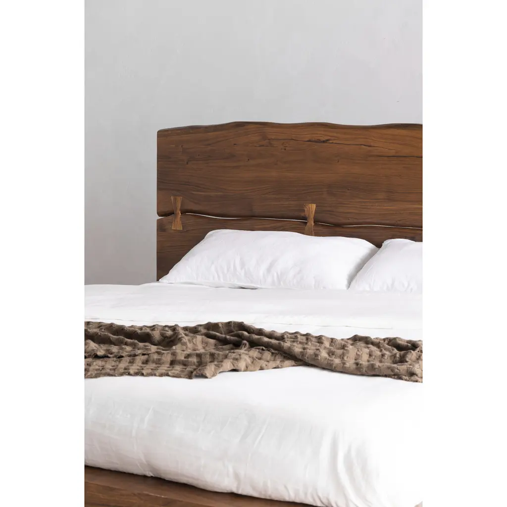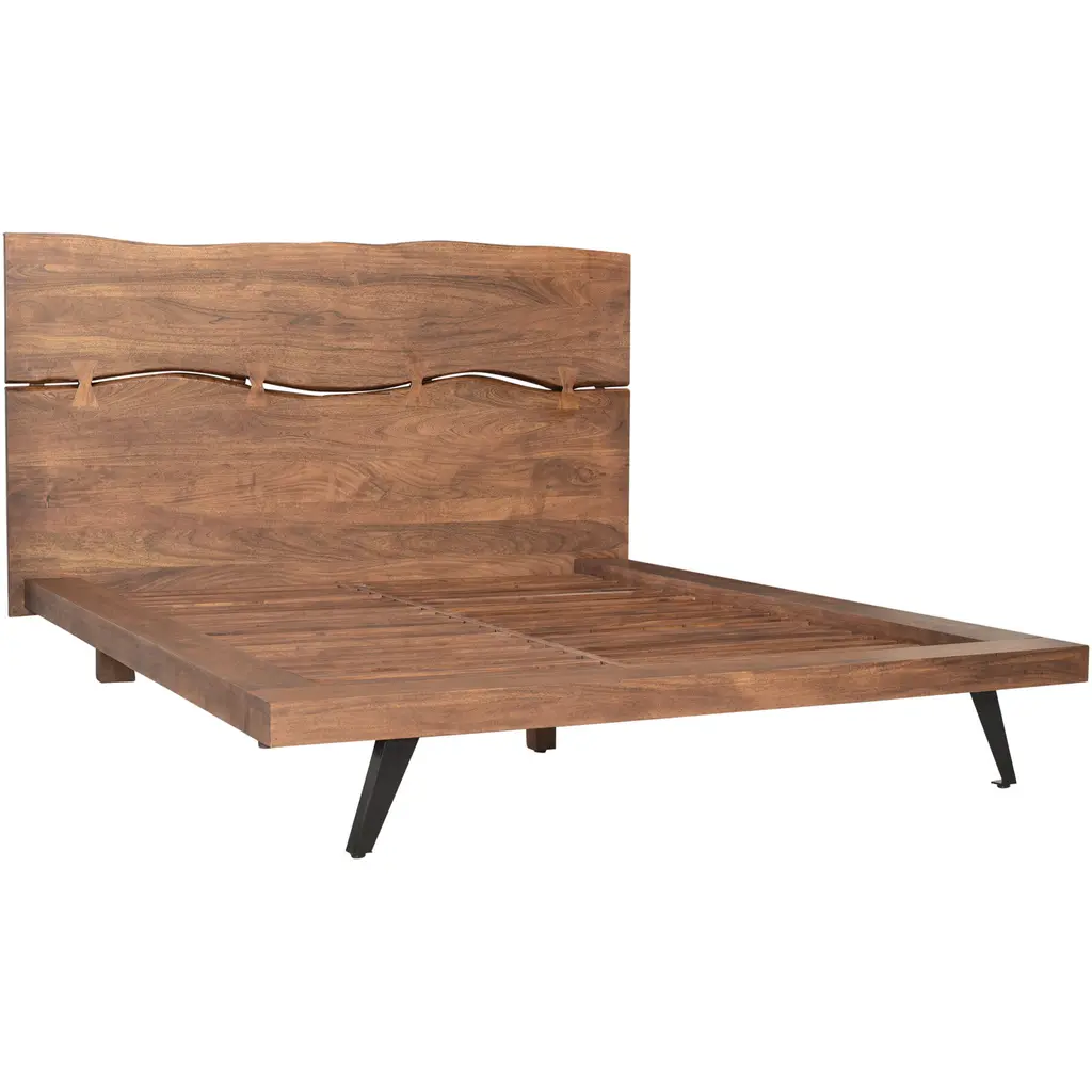 Add a soothing, natural touch to your bedroom. The Madagascar bed is made from solid acacia wood bed featuring a low platform design, with an organic edge headboard joined by a butterfly technique in woodworking. Solid steel legs in a black, powder-coated finish, provides a rustic - industrial overall look.