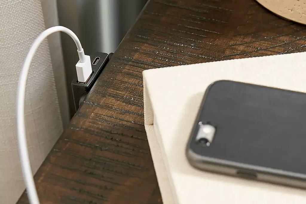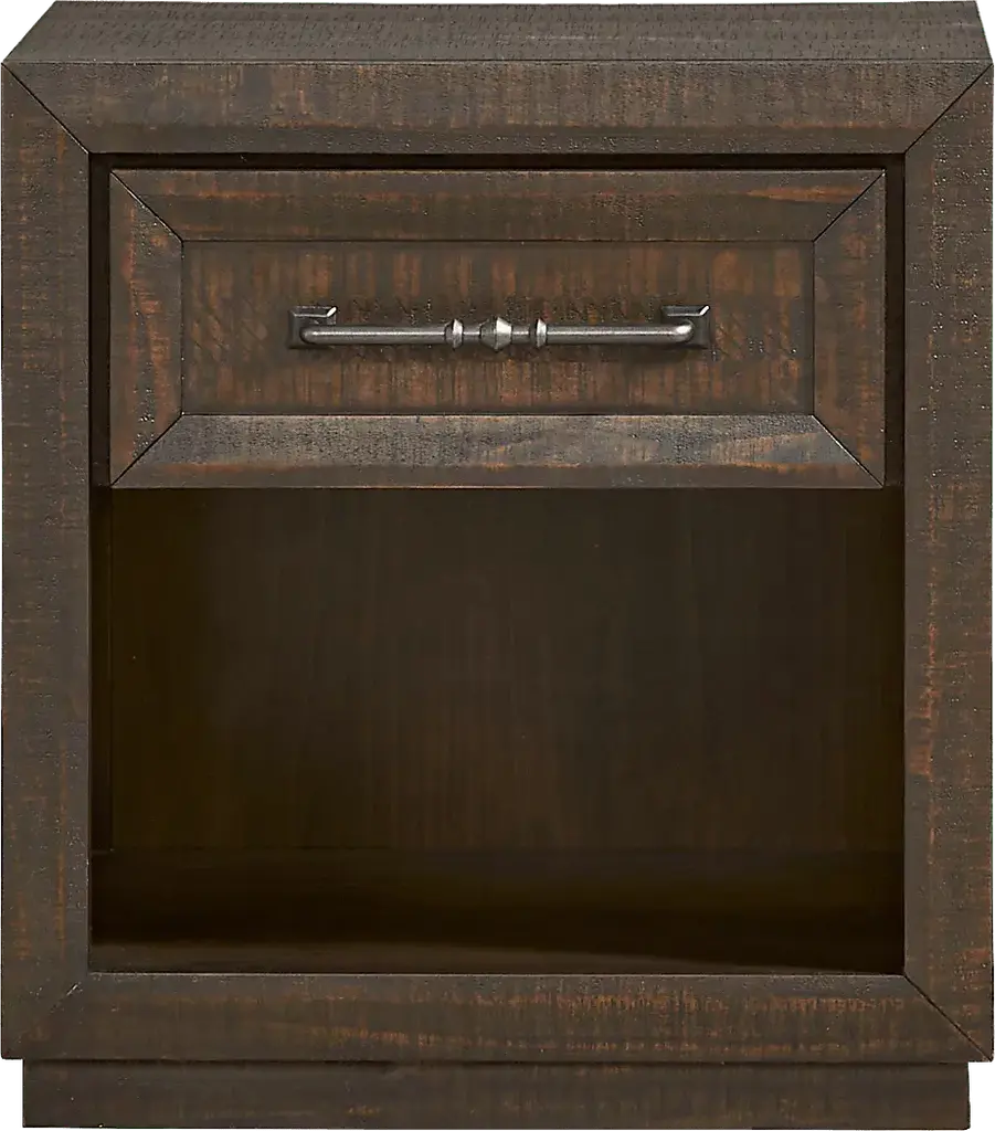 The quiet strength of a mountainside lodge taking in the crisp air of a morning breeze comes to life in the Mckinnon collection's tailored character, thoughtful details, and charming warmth. Rustic in style, this bedroom comes in a rich dark brown finish and features a panel headboard adorned with striking concentric molding. The floating, platform-style footboard introduces a modern touch, while matching pieces follow suit with plinth-style bases for a seamless, grounded look. The nightstand includes an integrated LED light for a touch of ambient luxury and built-in USB ports for convenient device charging. Custom iron gray bar pulls complete the ensemble with elevated details. Mattress and foundation (if required) sold separately.