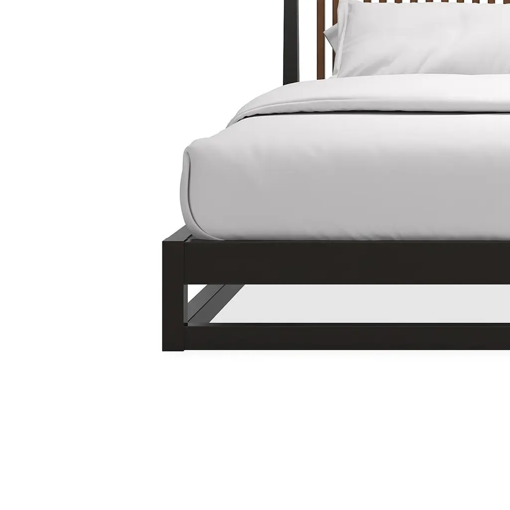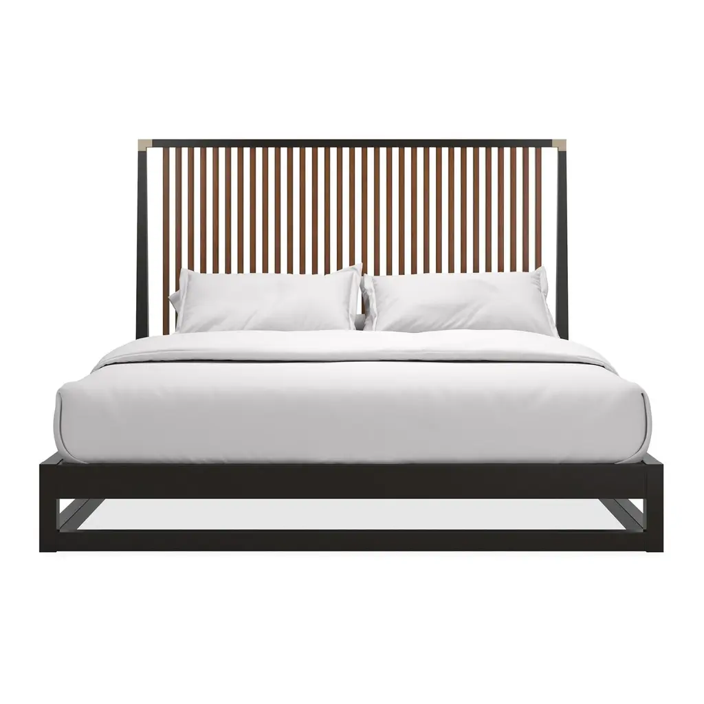 A stunning fusion of timeless elegance and modern functionality. This luxurious bed showcases a unique, raised wood-slat headboard made from premium Asian hardwood, accented by a frame in a rich Dark Chocolate finish. The inset slats, finished in a warm Rich Walnut, add depth and charm, creating a captivating focal point for any bedroom.Elegant Champagne Gold metal brackets accentuate the headboard, providing a sophisticated contrast to the wood's richness. Perfect for a mattress-only setup, this bed combines sleek design with durable, practical support—perfect for any space seeking a mid-century refresh.Dimensions:US King: 82.5" W x 86.25" D x 60" H