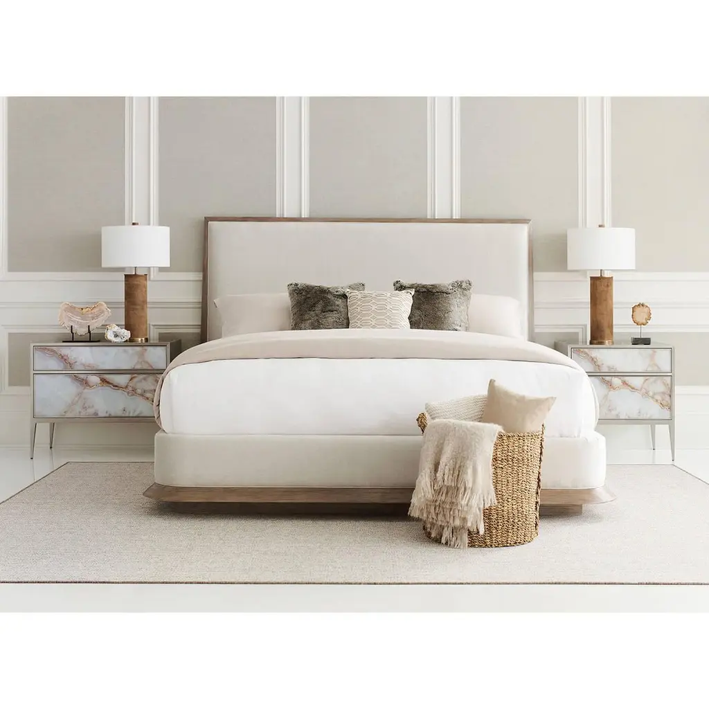 A modern ash frame platform king bed with a tall upholstered headboard. The stunning neutral fabric outlined with the Ash Driftwood gives this bed the look and feel of true luxury. This elegant bed has an elevated clean-lined design raised on a plinth base.Dimensions87.25" W x 92" D x 60" H.