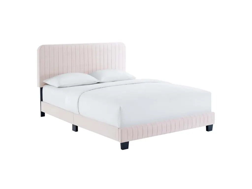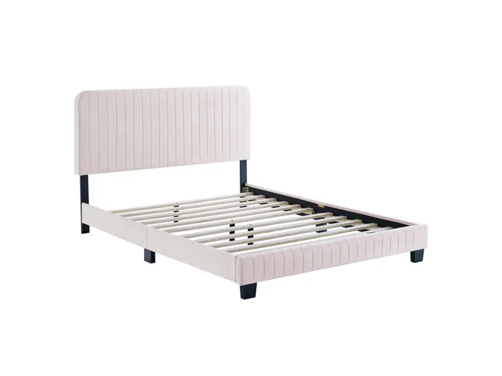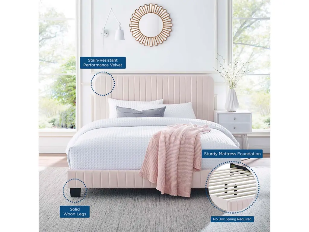 Elevate a teenager's bedroom or guest bedroom style with the luxe texture and glam deco elegance of the Celine Full Platform Bed. Adorned with channel tufted detail, the full size headboard of this upholstered bed is padded in dense foam to offer supportive comfort while sitting up resting, relaxing, reading, or watching TV. Upholstered in stain-resistant performance velvet, this platform bed eliminates the need for a box spring with a wood slat support system to allow for ample air circulation and a reinforced center beam and support legs for added durability. A sturdy mattress foundation, this full size platform bed accommodates a variety of mattress styles including innerspring, memory foam, and latex. Assembly required. Weight limit: 800 lbs.