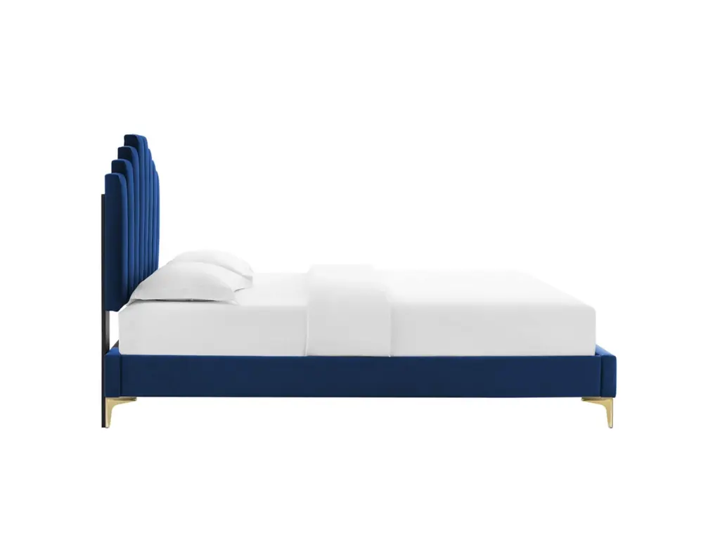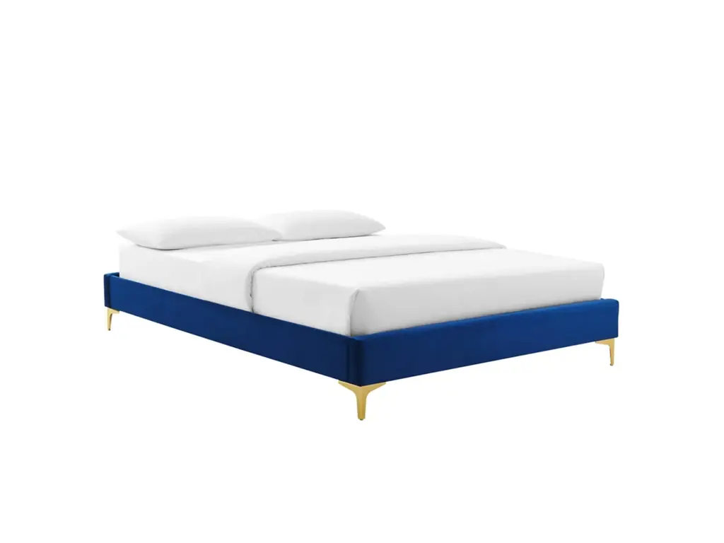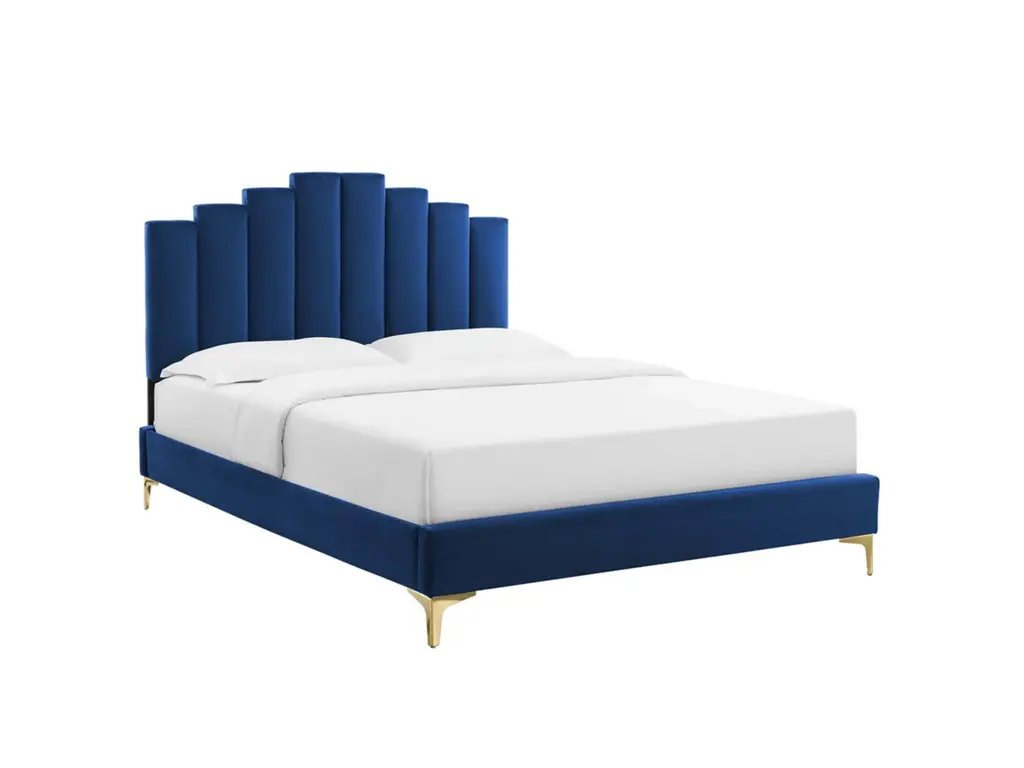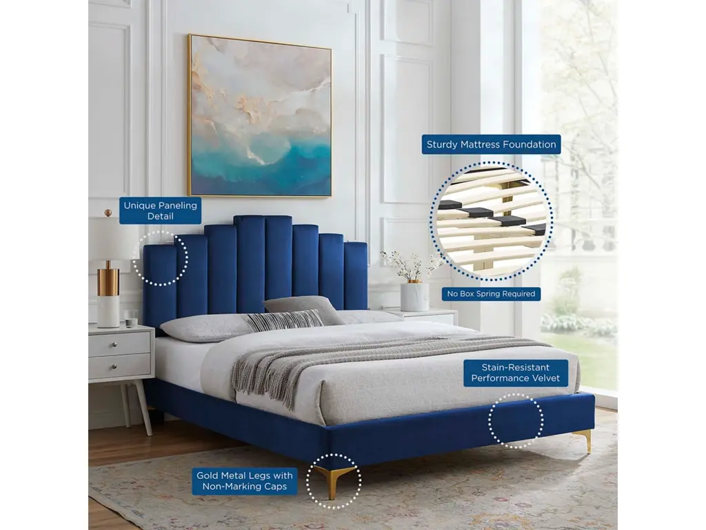Refresh a guest bedroom or teenager's room with the luxurious style of the Elise Performance Velvet Full Platform Bed. Abounding in glam deco style, the full headboard of this platform bed features a modern twist on classic channel tufting with velvety panels ascending upwards in an arching design. Resting atop gold metal legs, this upholstered bed is covered in soft, stain-resistant performance velvet and dense foam padding. This full size bed is a sturdy mattress foundation for memory foam, innerspring, latex, and hybrid mattresses. With supporting legs and a reinforced center beam, this upholstered bed is complete with a poplar wood slat support system that offers lasting stability. Assembly required. Full Bed Weight Capacity: 800 lbs.